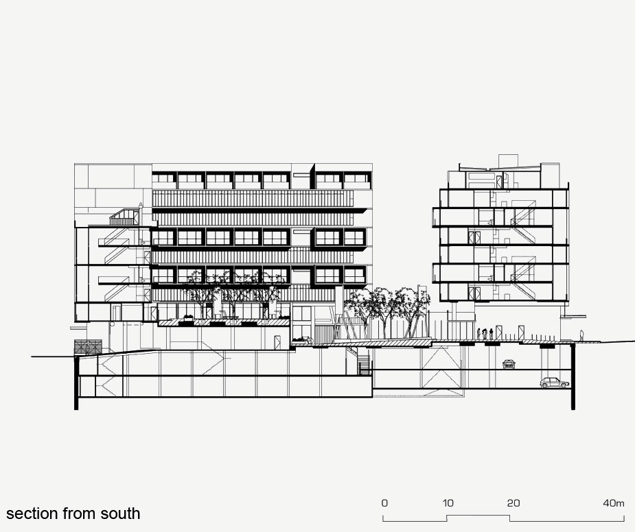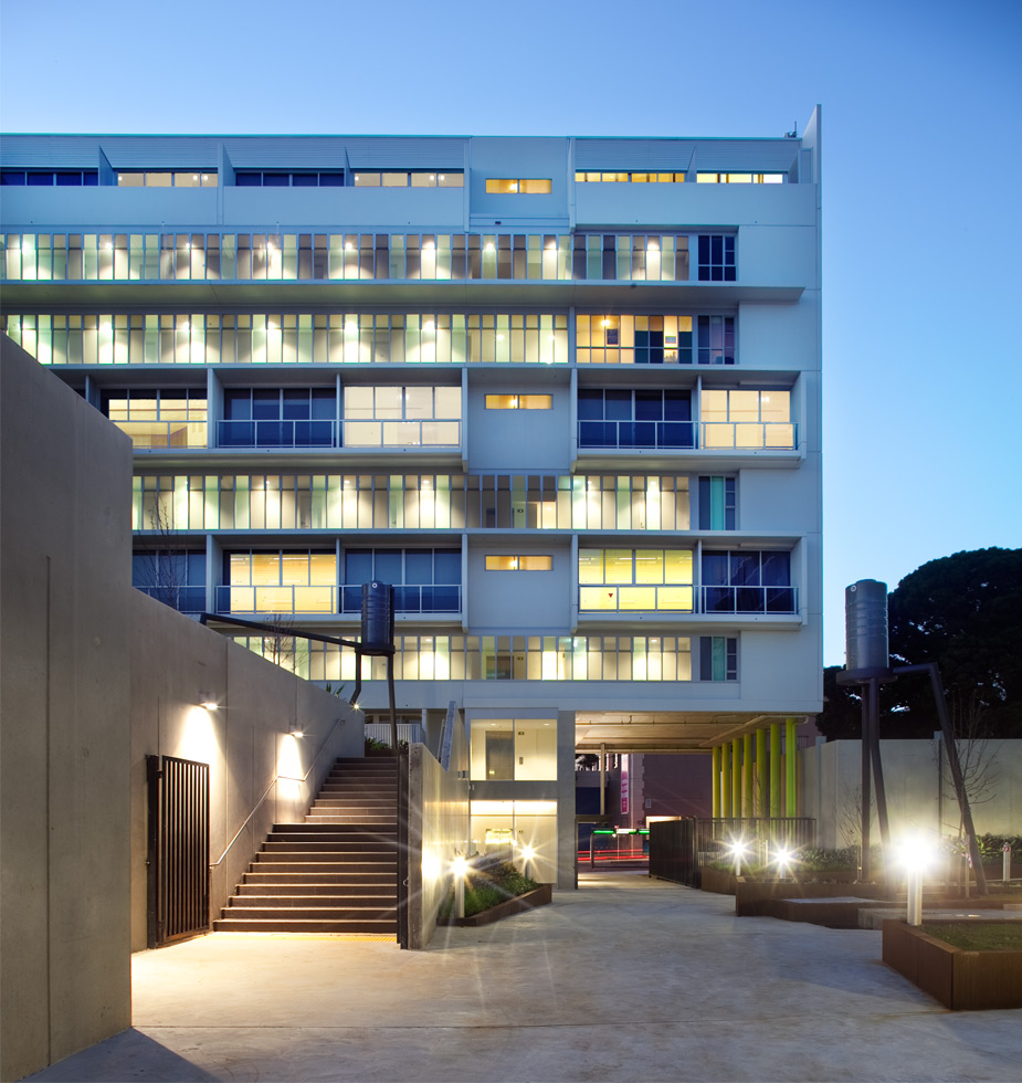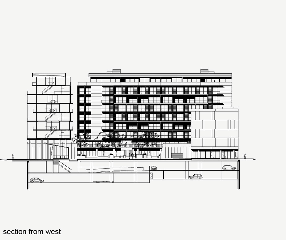 The project contains 122 apartments, professional suites, street level shops and supermarket. The two storey apartments accessed from cross-over corridors and galleries have through-flow natural ventilation, solar access, light and excellent climatic control.