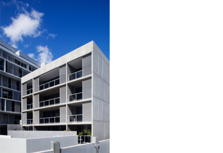 The architectural concept for the site is four perimeter buildings facing north, east and west, fragments that define a multi-level, central courtyard. The buildings step up from 4 to 9 storeys, from Retreat Street to Botany Road, to provide a calibrated and measured response to the diverse street conditions and existing building fabric. The courtyard is traversed by a through-site public way.