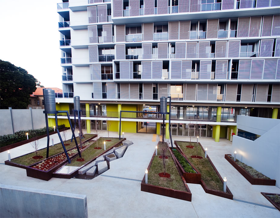 The central communal courtyard is a multi-functional space that provides ground level access to adjoining dwellings, privacy between habitable rooms, deep soil tree planting and site based water retention. A upper level communal courtyard at the north-west corner of the site is planted with a grove of trees and ringed with apartments suitable for home offices. The RTA road widening area on McEvoy Street will be paved and planted.