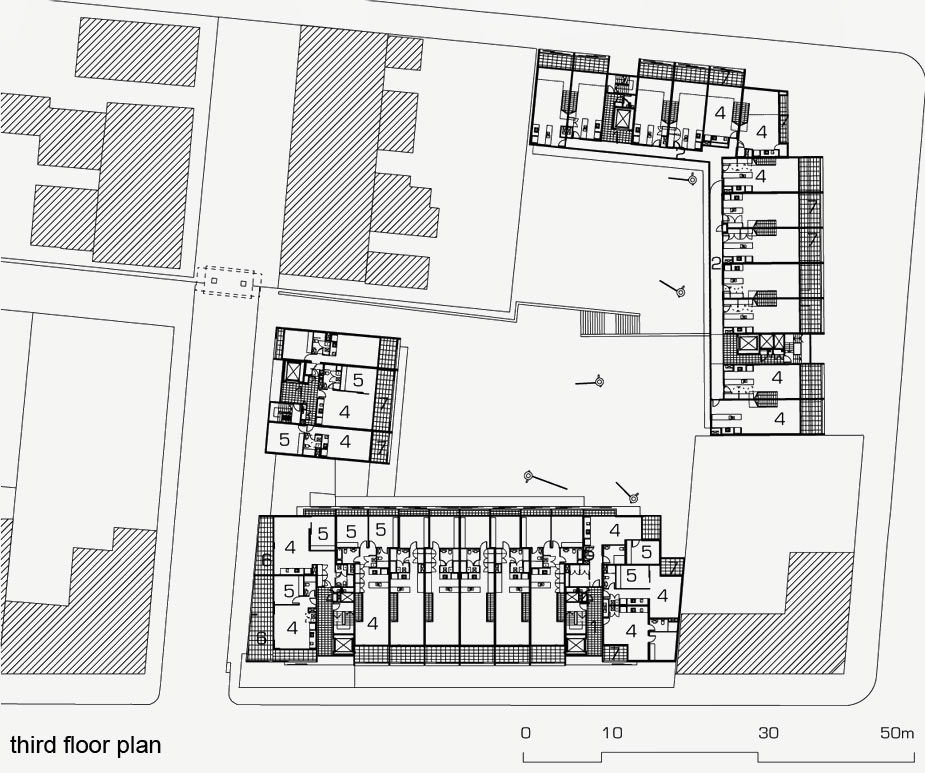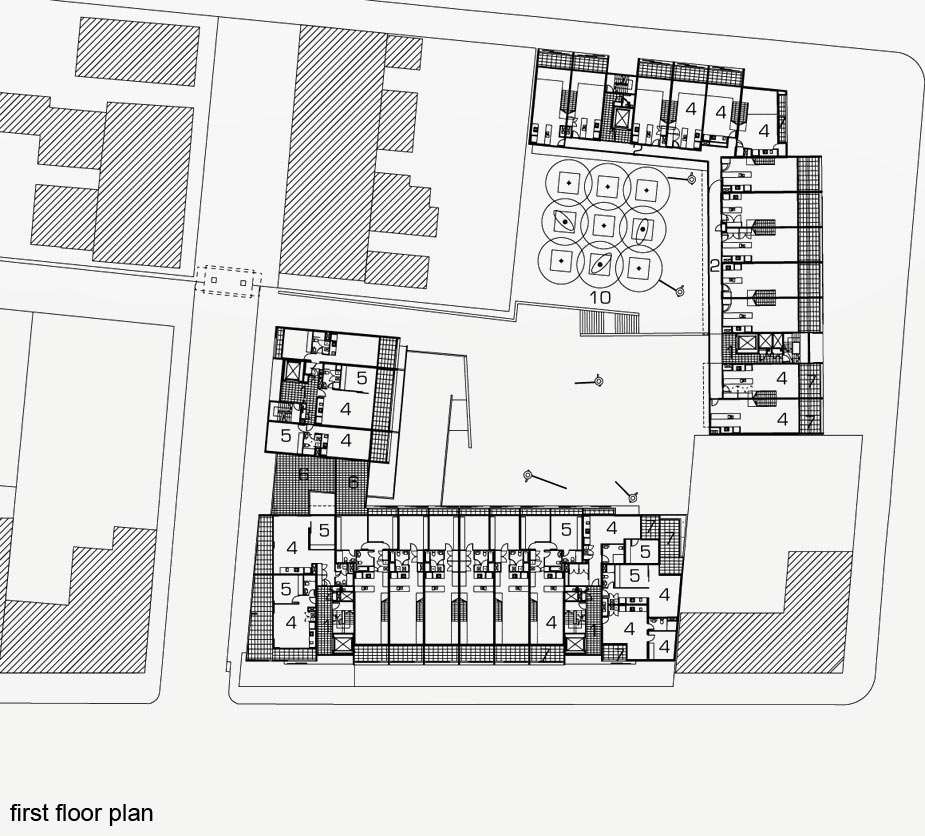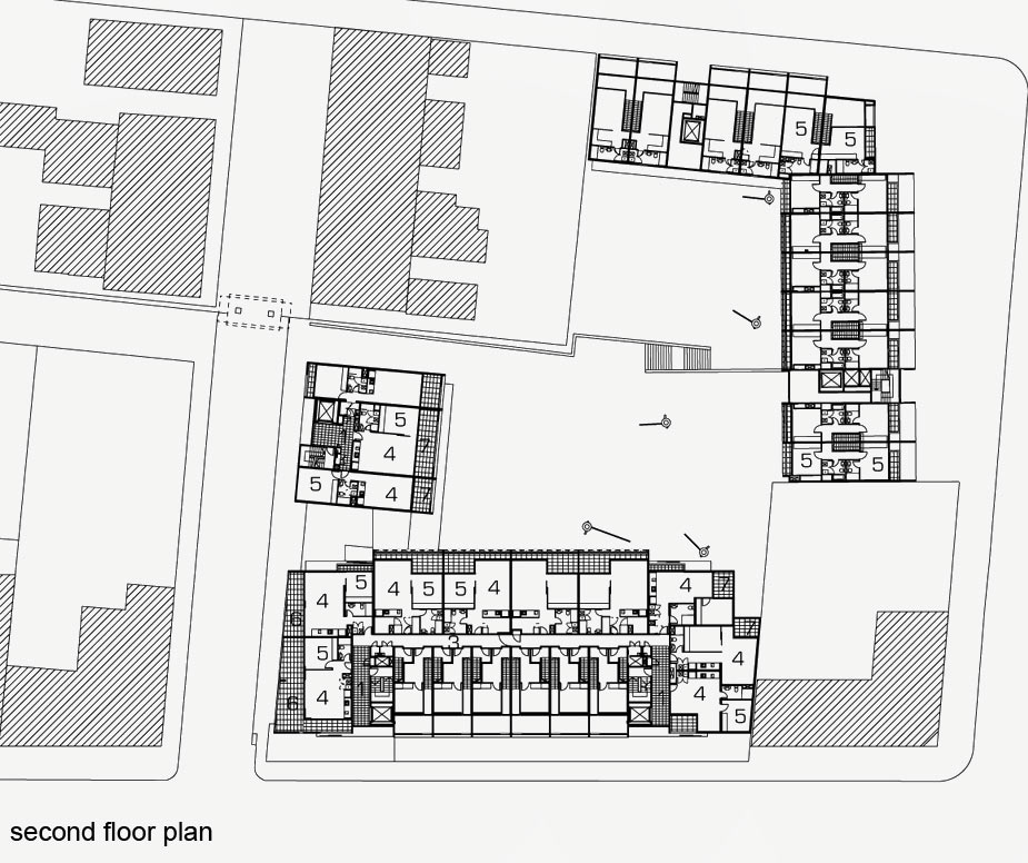 The buildings have a crate-like, cellular appearance to the street, defining living areas and deep balconies. The elevations of the central communal courtyard are simpler in character, containing mainly bedrooms and glazed access galleries. Roof terraces of the McEvoy Street building are accessed by stairs from lower level units. The elevations express the different sectional qualities of each building.