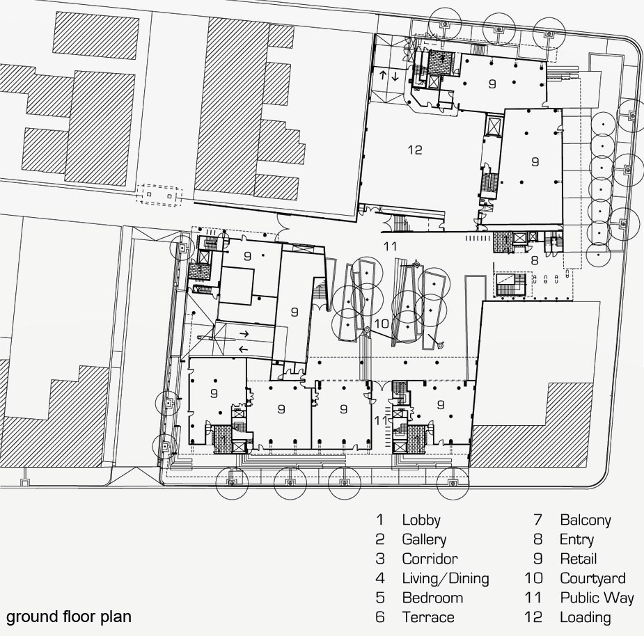 The four perimeter buildings are walk-up, gallery and cross-over forms: 4 storey, walk-up building on Retreat Street, 4 to 6 storey, gallery building on Wyndham Road, 8 storey gallery building on McEvoy Street and 9 storey, cross-over building on Botany Road with the top storey setback from the street boundary to maintain the strong wall definition of the neighbouring apartment building. The highest building is at the corner of Botany Road and McEvoy Street, and replicates the height of the building at the corner of Botany Road and Mandible Street, at the southern end of the block.