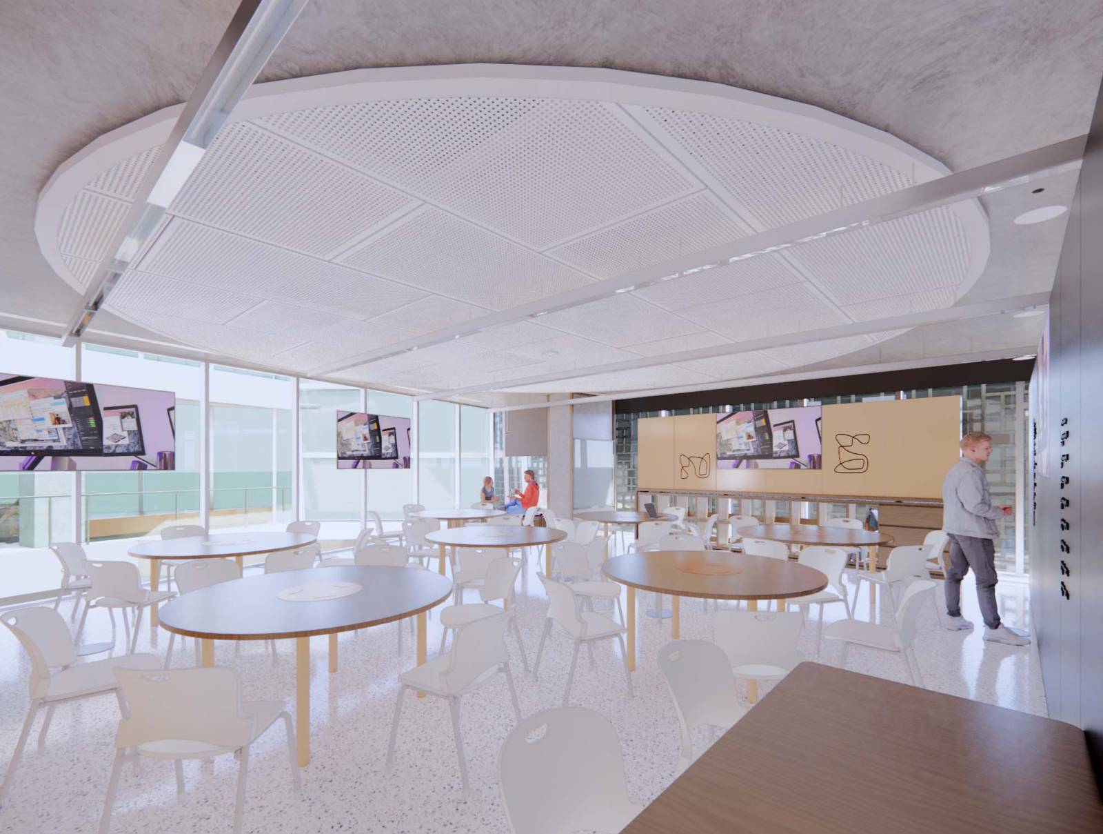 This digitally focus teaching space minimises the hierarchal structure of educator and student by utilising round tables beneath a round acoustic panel ceiling to encourage collaboration in an active group working environment. All creative wall surfaces are writable to allow students to brainstorm and develop their ideas and encourage discussion. Digital technology has been integrated into collaborative walls with in a minimal aesthetic.