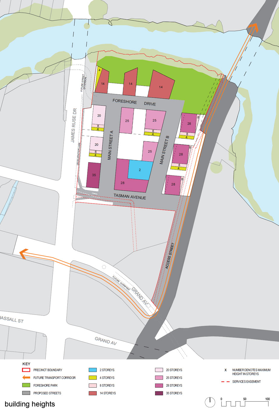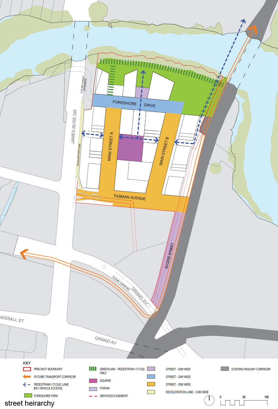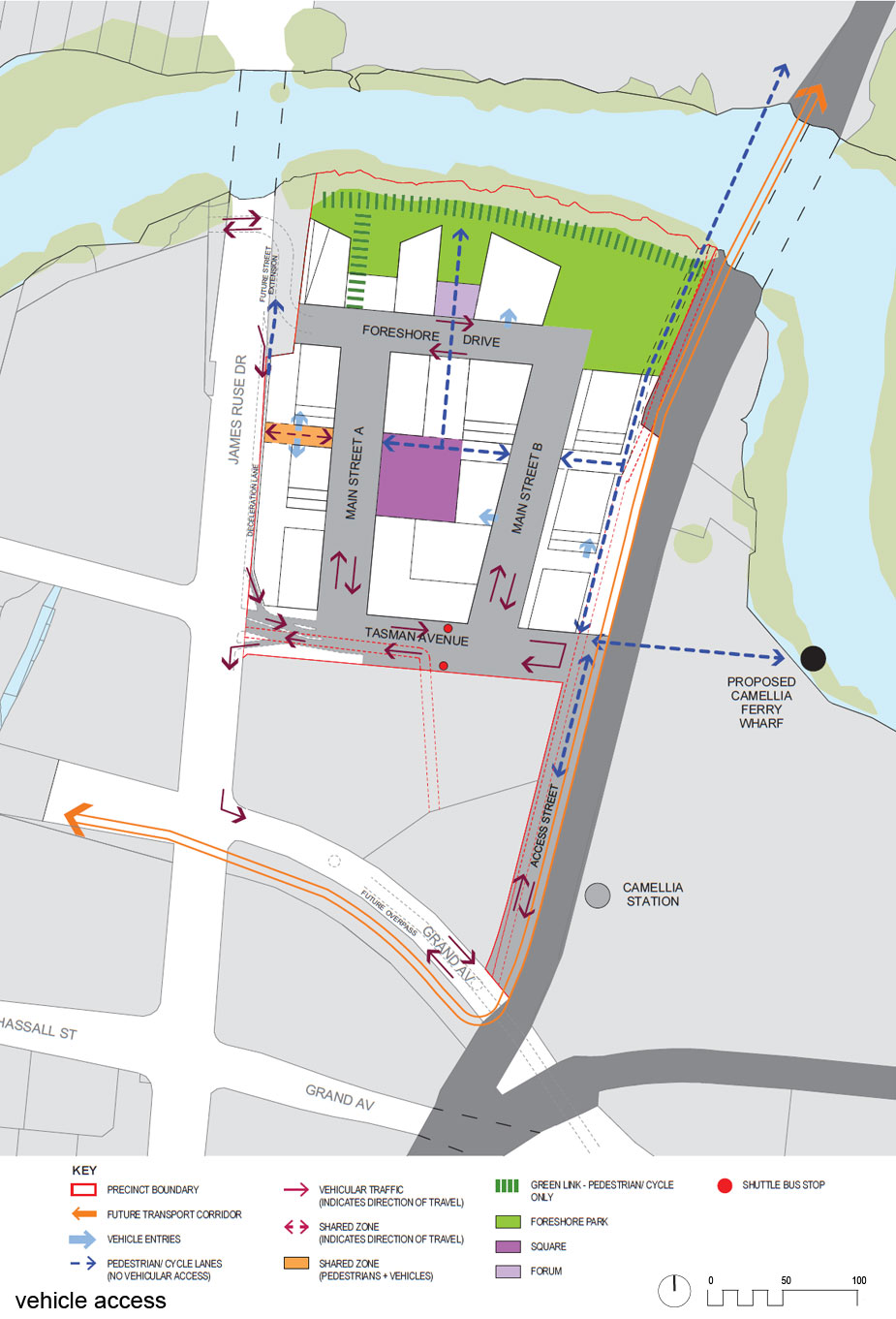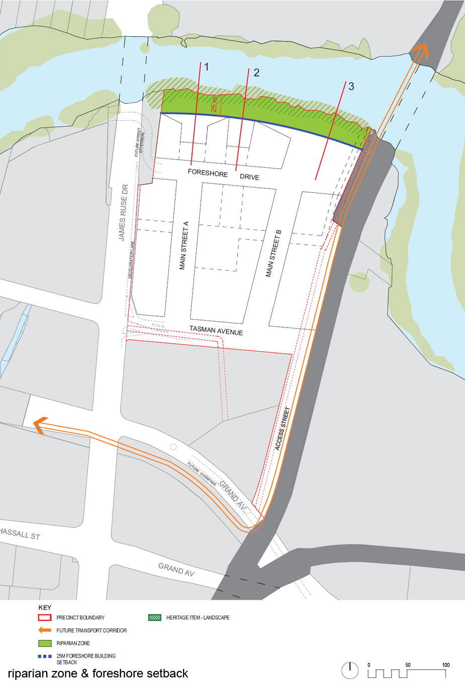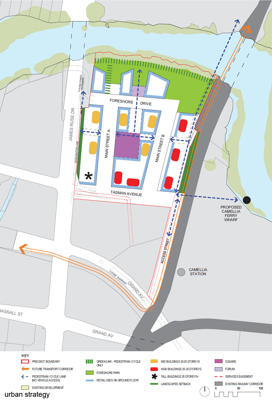 The site is bound by Parramatta River to the north, Clyde/ Carlingford rail line to the east, existing factory and heritage listed pump house to the south and James Ruse Drive to the west. There is an access handle to Camellia Station at Grand Avenue North. commercial uses. The site and adjoining mangrove and river habitat requires extensive remediation.