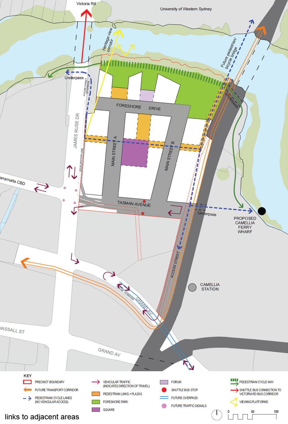 The project will be connected to the Parramatta CBD and University of Western Sydney by a light rail network and pedestrian-cycle bridge. A new ferry terminal is proposed to the east of the site beyond the railway line to provide a connection along the river to Sydney CBD and provision will be made for the site to be connected to this ferry terminal.