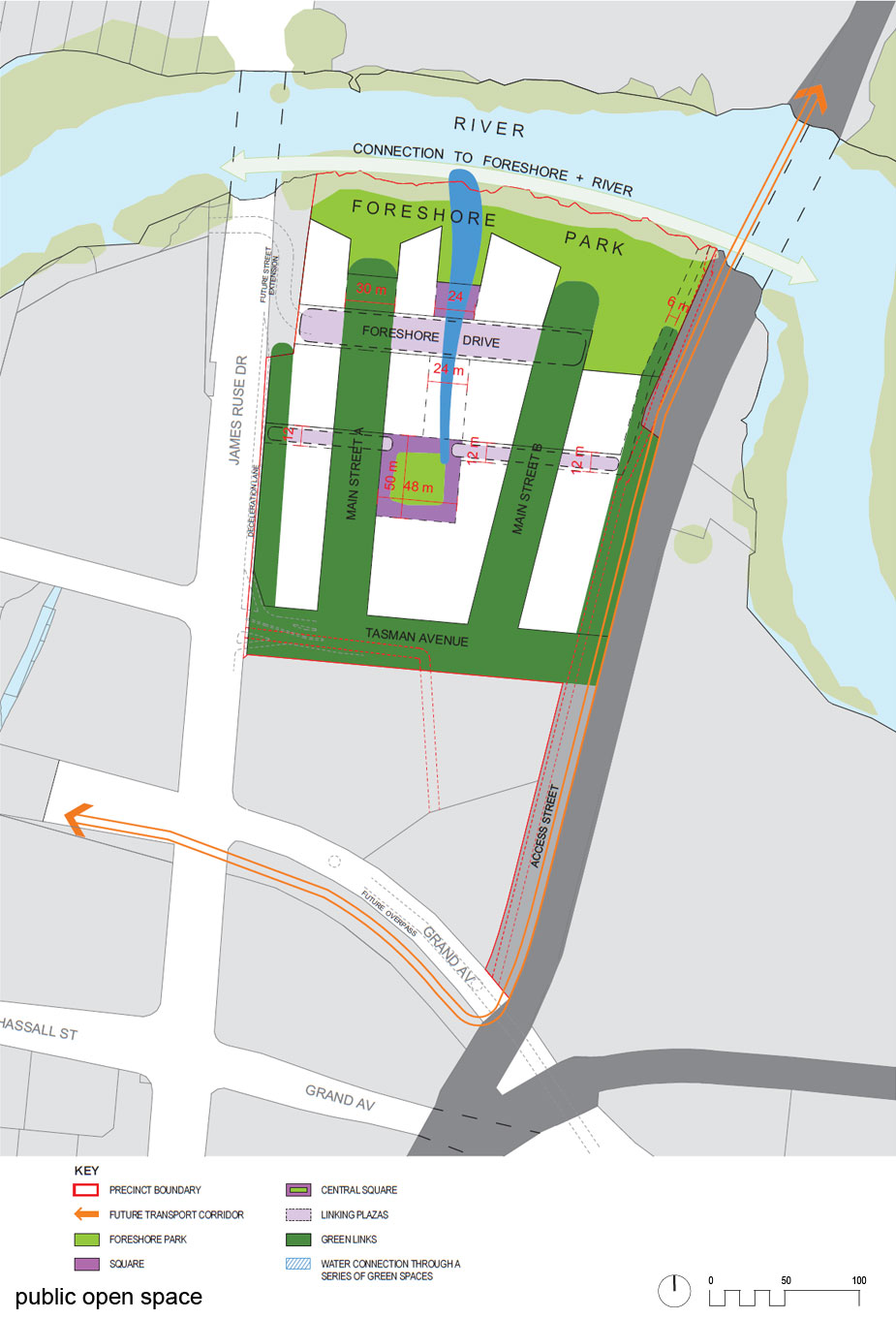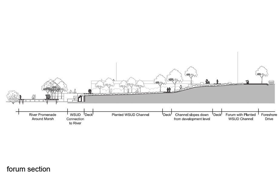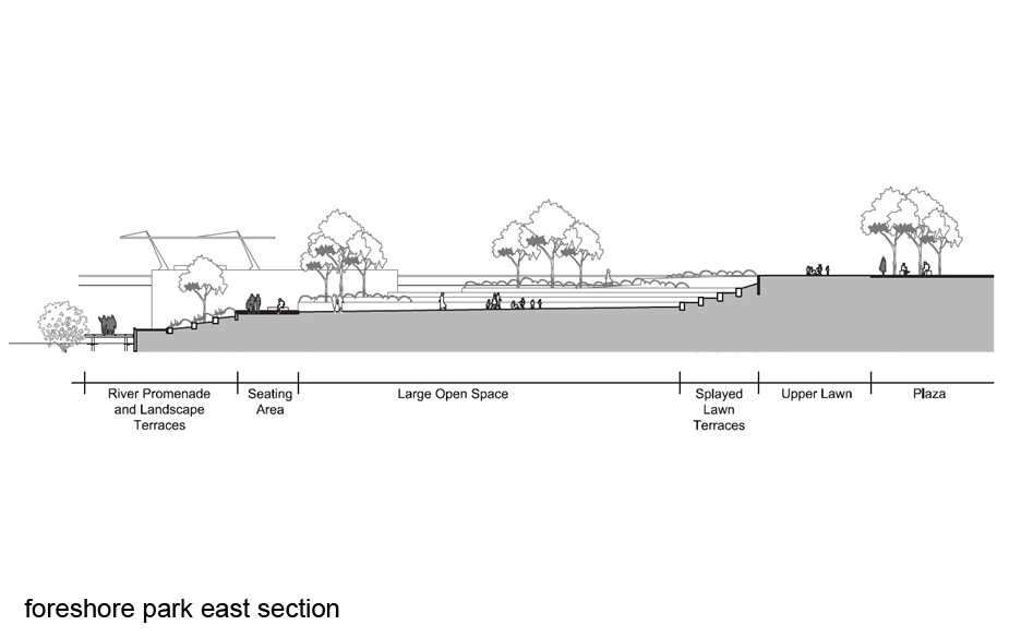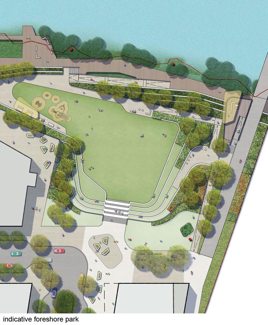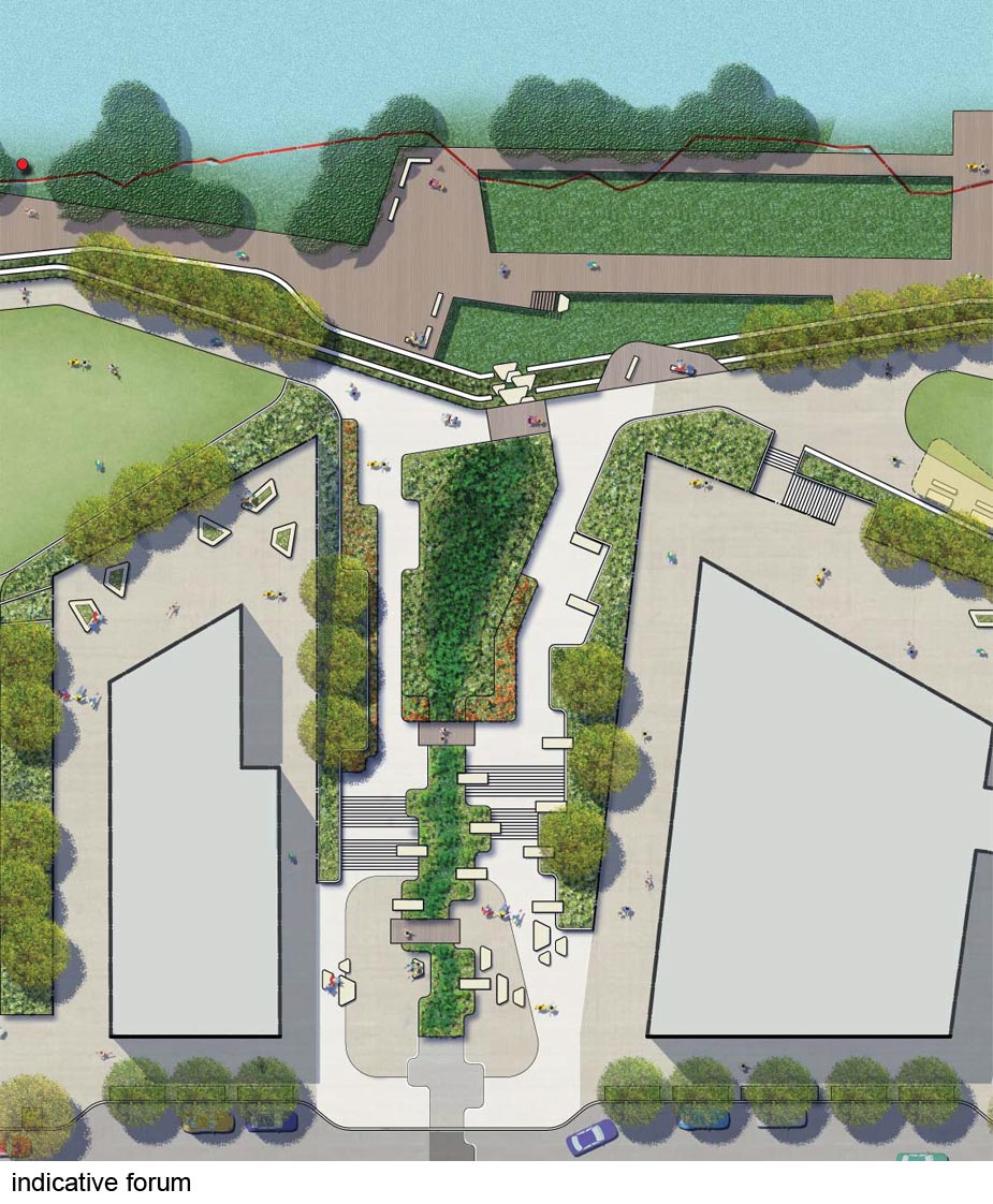 The vision for the site is to create an interactive, urban living environment within a rehabilitated river setting. The project will be framed by an extensive and permeable public domain comprising foreshore walk, foreshore park, central park, forum, wide avenues and building forms of various heights orientated to optimise views, breezes and sun. It will evolve into a focal point within the wider precinct with active uses at ground level.