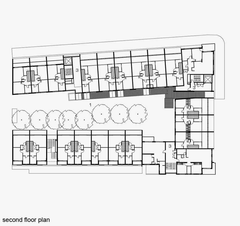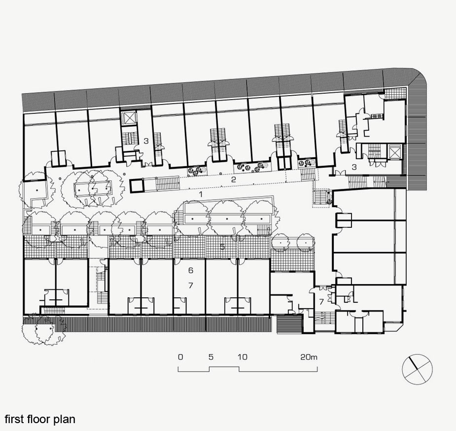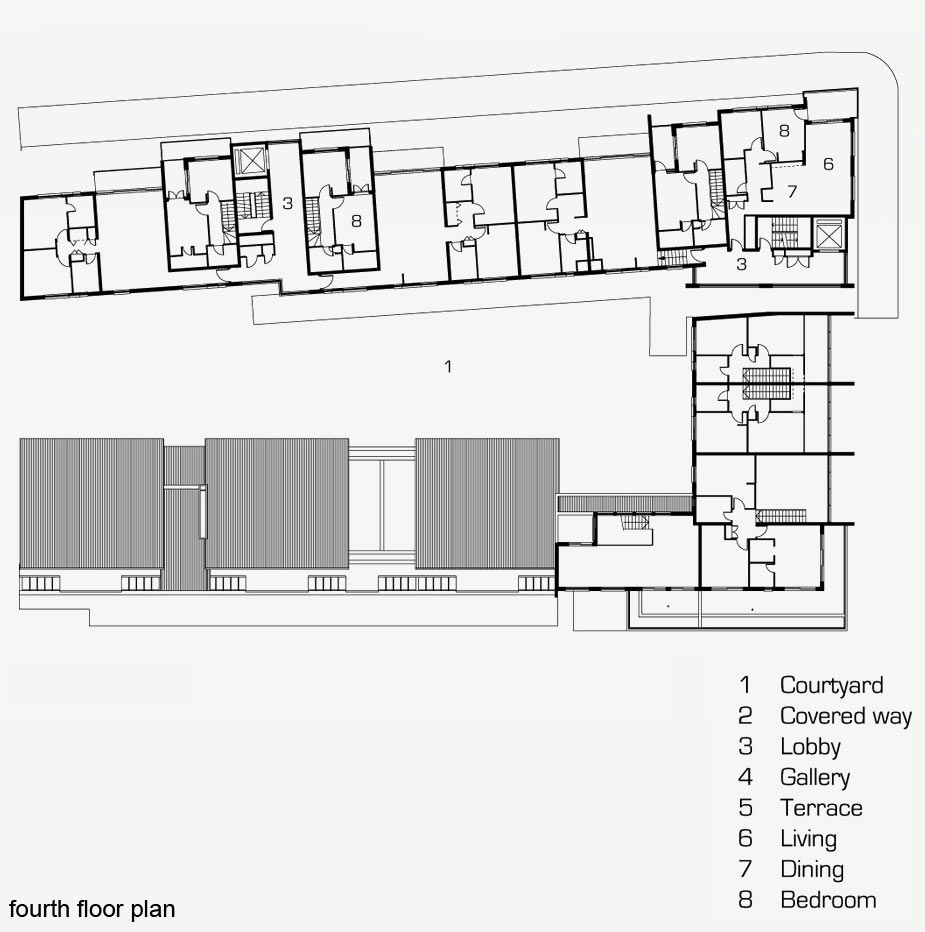 The one and two storey apartments are planned around two lift lobbies, access stairs and glazed galleries and include over 50% two storey lofts and maisonettes – all of which have generous balconies and terraces. Most apartments can be accessed from lobbies at both street and the secure common courtyard. Glazed, external galleries provide access around the courtyard at various levels.