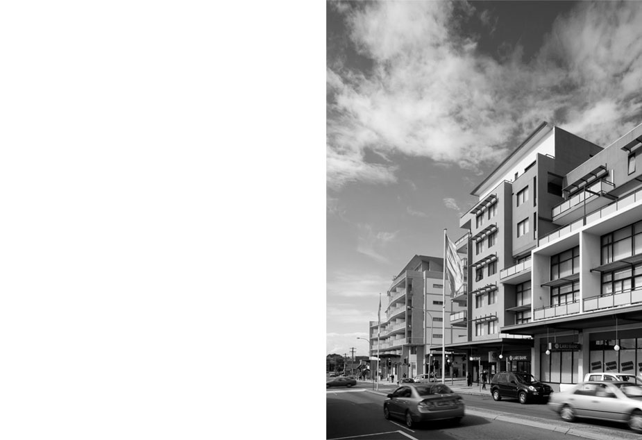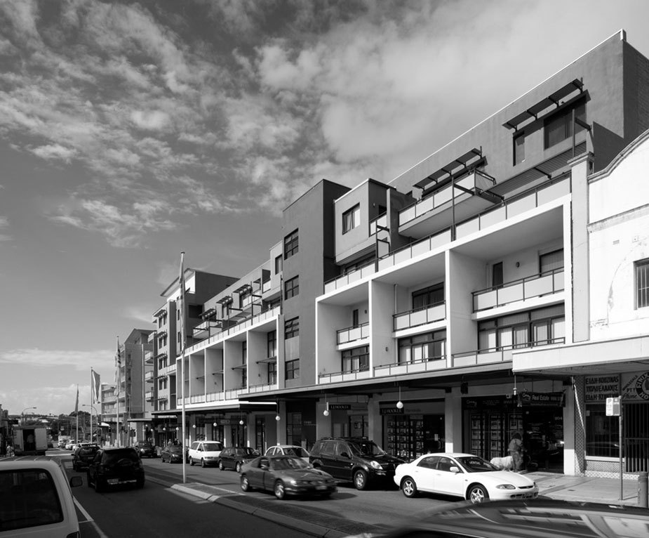 The design challenge was how to sensitively insert a large modern structure in a setting of small scale, historic shops and residences. The architectural concept is a fragmented, perimeter, street-based form of three connected components, sited around a sun-filled courtyard. Domain is located in the inner Sydney suburb of Marrickville, at the corner of its main street Marrickville Road, and cross street Victoria Road. The project is an example of ‘shop-top’ housing at the depressed eastern end of Marrickville Road. It comprises shops and professional suites at street level, topped with 48 apartments, placed around a common, secure and light-filled communal courtyard.