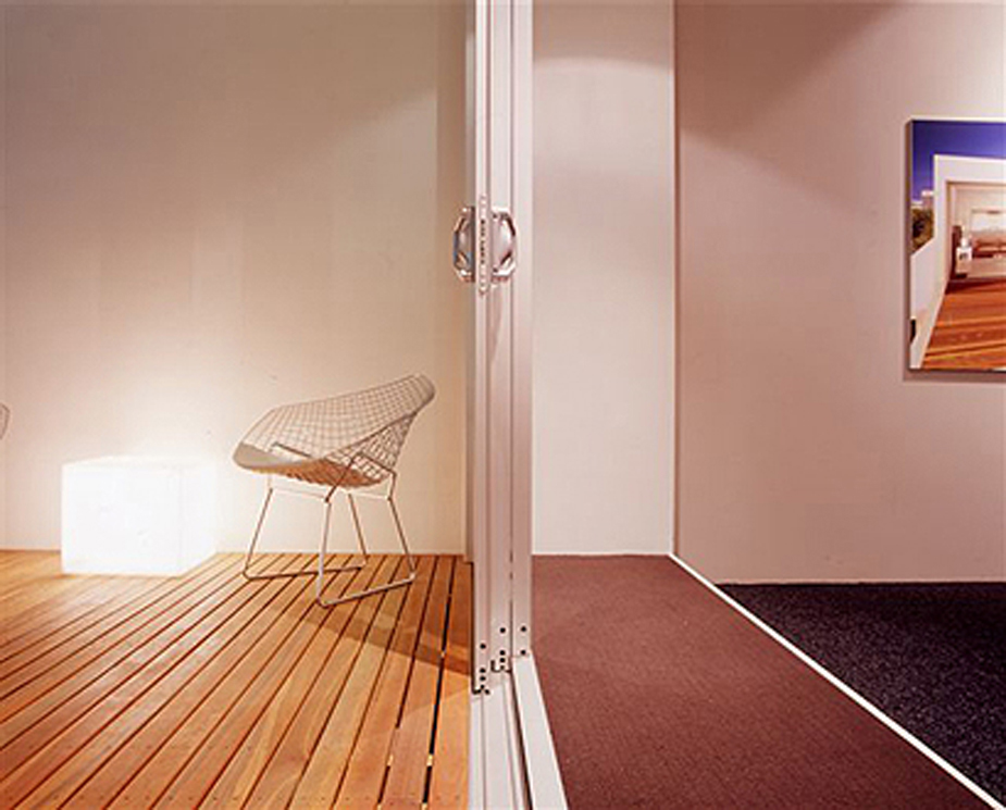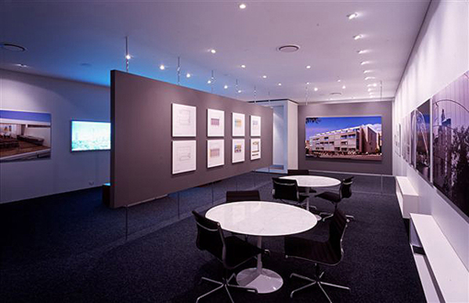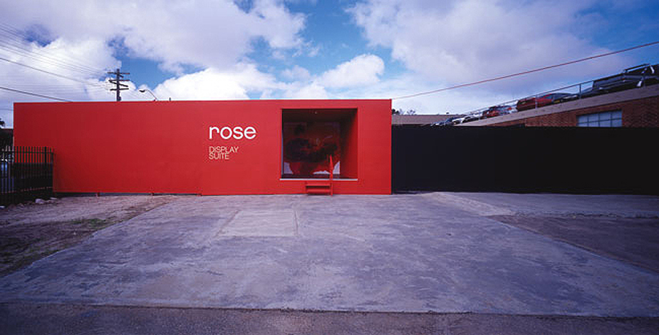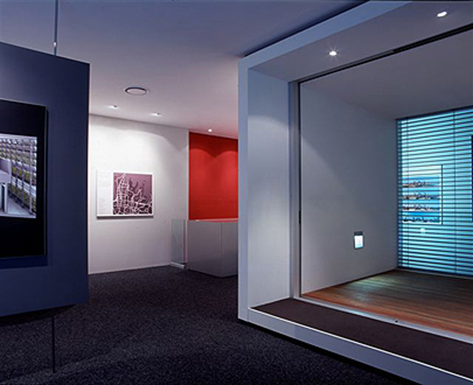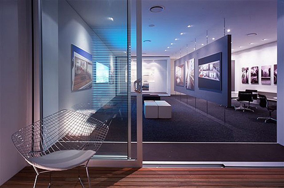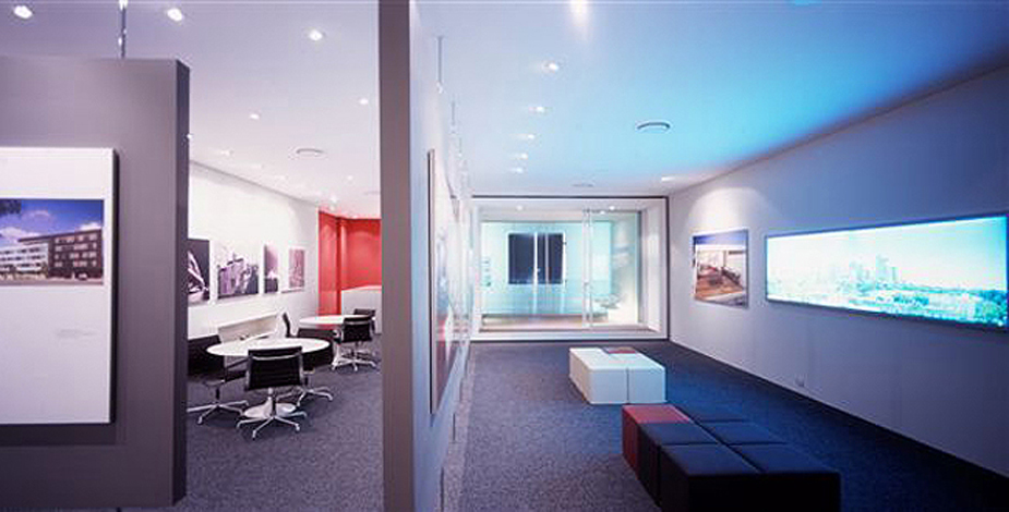 Display and marketing suite in warehouse building on site of development for 137 apartments; marketing area and fully furnished 2 storey + 2 bedroom apartment display suite seamless inside/ outside, f…
