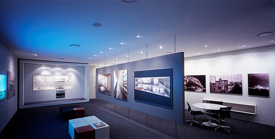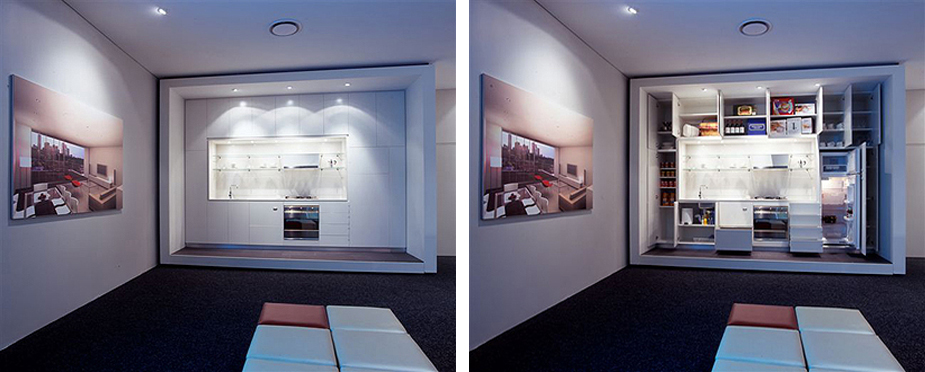 Display and marketing suite in warehouse building on site of development for 31 apartments and 140 sqm shops, marketing area with kitchen and balcony elements of single storey apartment.