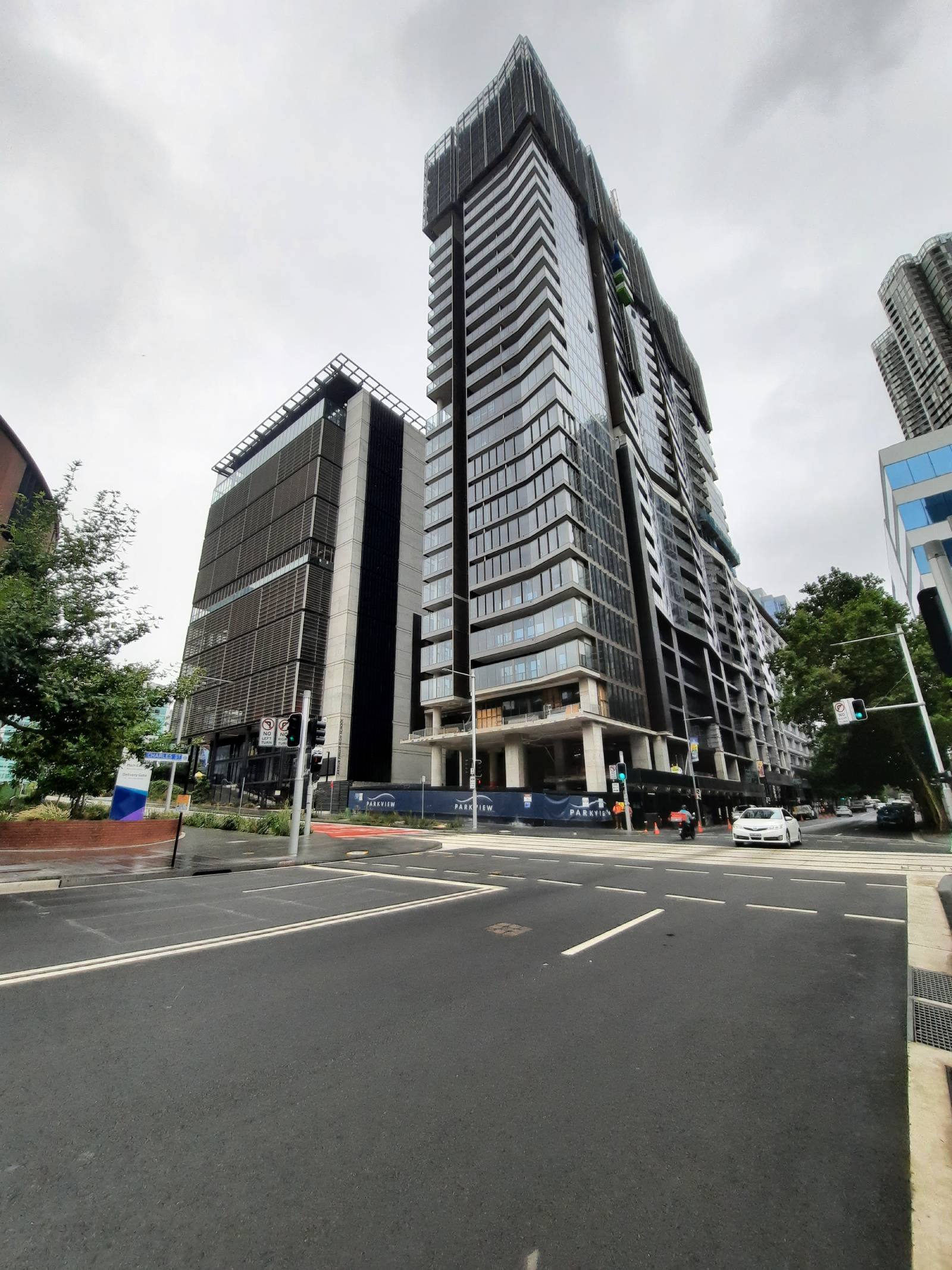 The tower is divided horizontally into five stacks of 9 storeys generally and four stacks on Charles Street to accommodate the street wall component with the insertion of two storey recessed sky terraces and bio-lounges at the base of each stack. The sky terraces act as green portals for collecting fresh air. The sky terraces and bio-lounges are positioned at the north-east and south-west corners of the tower to capture views to Parramatta River and historic city centre. All sky terraces and bio-lounges are for the use of all residents and visitors. The child care centre is located in the lower level of the tower and is apparent by the recessed horizontal slot for the open air play area on the Charles Street elevation.