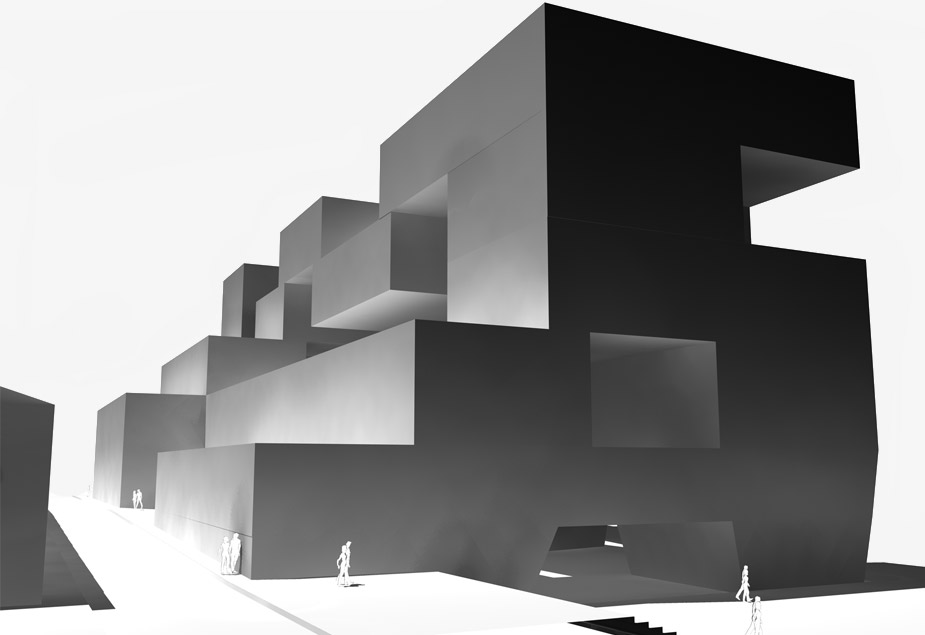 The hyperform has hybrid-uses with shops and offices on the first two levels and housing above. The block is developed with a streetscape that extends into the site, through -site links, gallery circulation, private and communal courtyards, and roof-top gardens. It is perforated with voids, volumes and yards that are carved out of its mass. The project investigates the use of external spaces as a formal device to break up the mass of a building and to create new ways of living. It explores how much spaces might be identified and inhabited in hybrid-use projects.