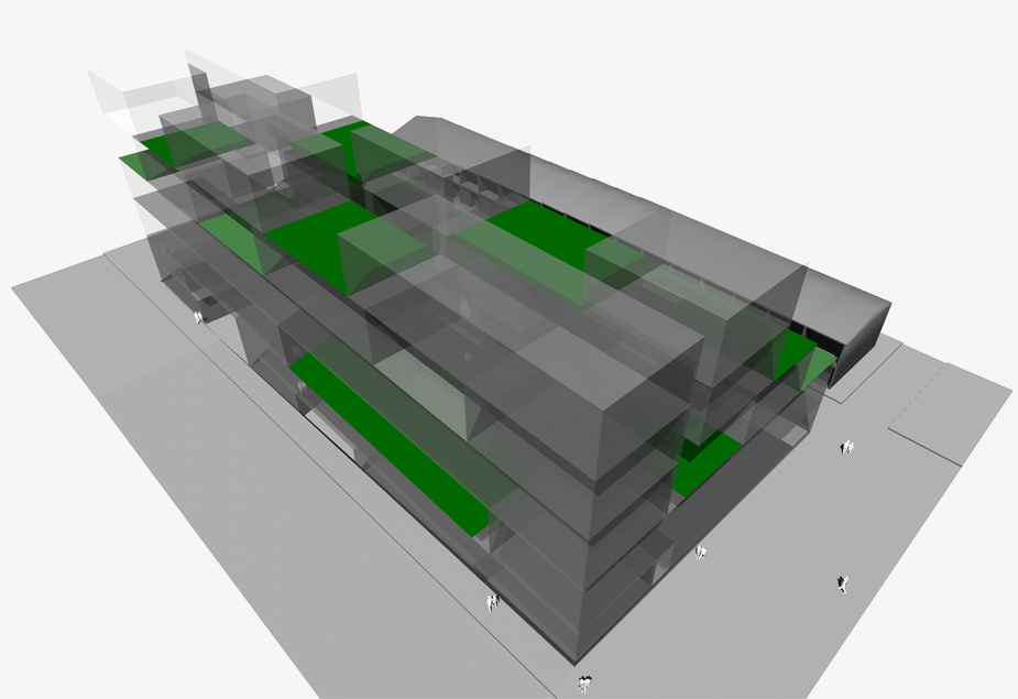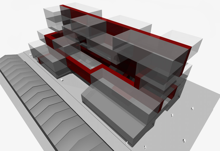 The block is perforated to create deep recesses, voids and platforms for indoor/outdoor living. It is a counterpoint to the slim-line building forms that maximise perimeter but create predictable living experiences, driven by minimum standards rather than by diverse experience. The hyperform avoids the text book and prescriptive urban design approach. The perimeter is folded back into the main form to create pockets of spatial complexity. The porosity of the block alleviates its visual mass. The block responds to envelope, required ratios of floor space and maximum height constraints. The block is 40m wide, 80m long and 36m high (10 storeys); the cross section is maximum 12m wide. The block is below the sprinkler height.