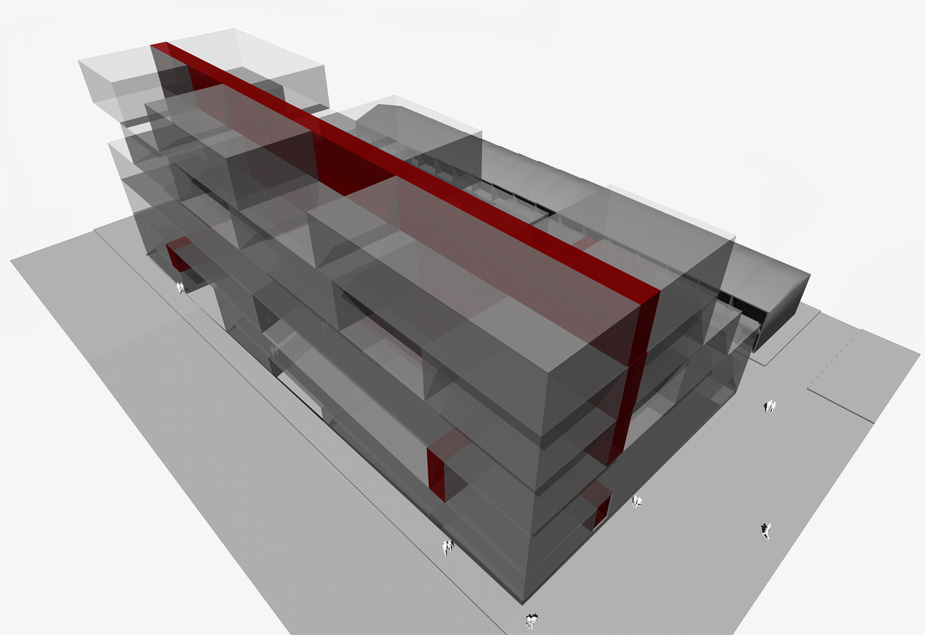 This hybrid-use project is an exploration of hyperform – a massive, urban scaled block that supports new and diverse living spaces – it is a radical departure from the low density suburb with its detached dwellings, front fences and driveways. Whether or not it is considered to have achieved its maturity, this project engages with important issues for living – the need for expression of individuality, density and the potential for variation in design. The project revives the modernist theme of replication.