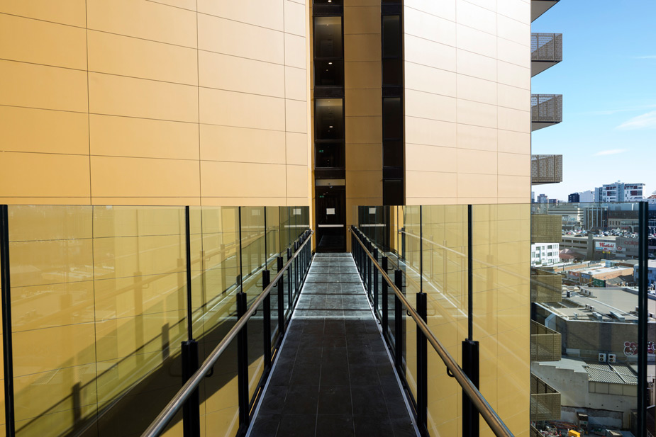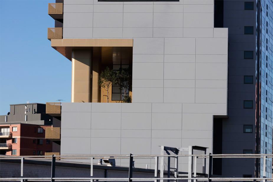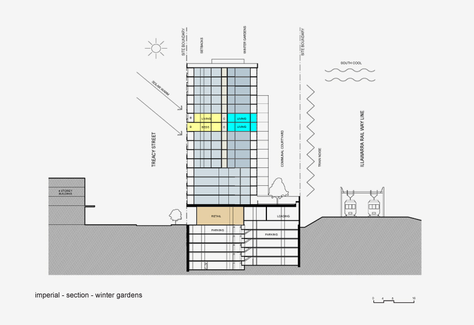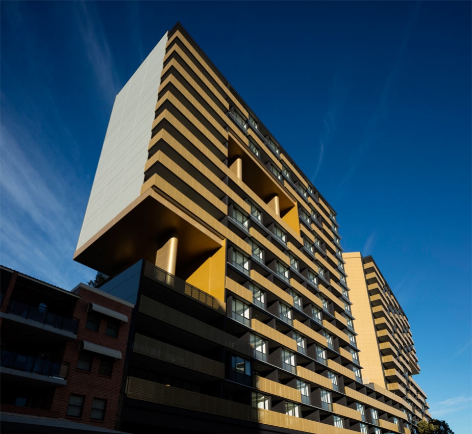 The iconic appearance of Imperial arises from its unique split form, punctuated by sky gardens, and metallic facades. The building is an icon, not just for Hurstville, but for Sydney and Australia. It is the next step in the evolution of the apartment tower. The building appearance primarily emphasises the site’s dual orientation: to the sunny north over the Hurstville City Centre and the cooler south over Kogarah. The northern street elevation to Treacy Street is fitted with a metal ‘jacket’ that is placed over balconies. The ‘jacket’ is a second skin, an environmental filter that screens the living areas and bedrooms from the hot sun in summer and reduces heat loss in winter. The south elevation to the Illawarra railway corridor is a ‘glass screen’ with wintergardens enclosed by operable glass panels that reduce noise and heat loss in winter.