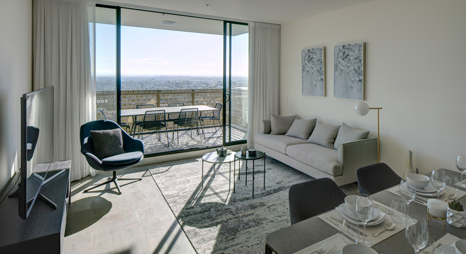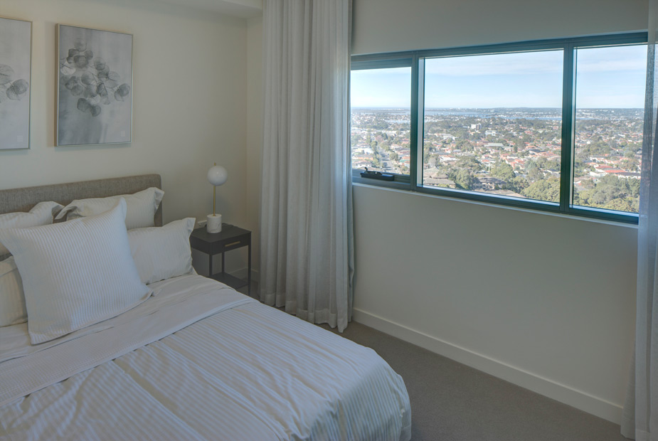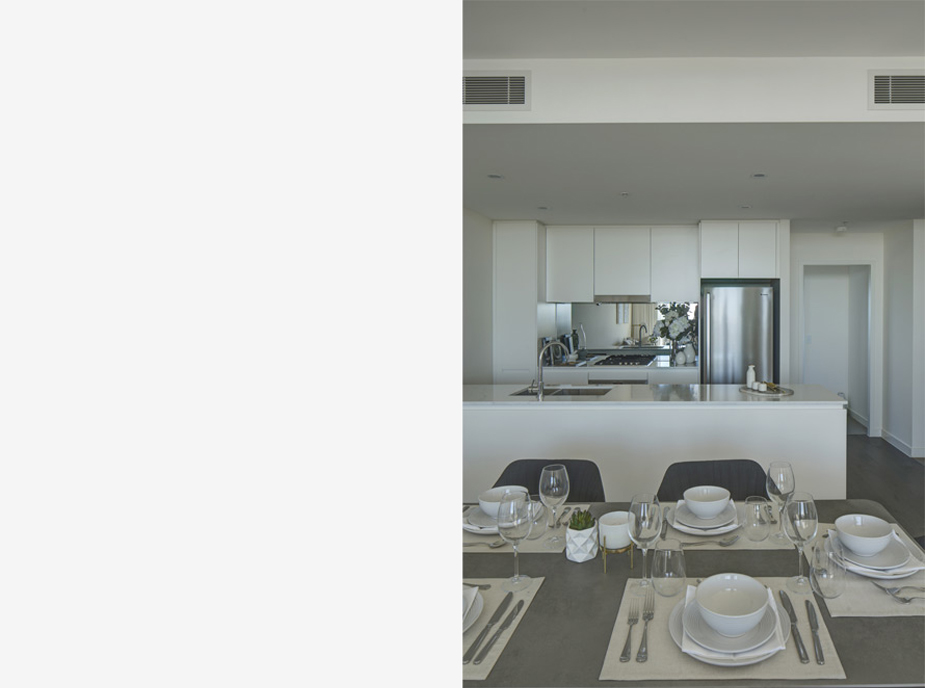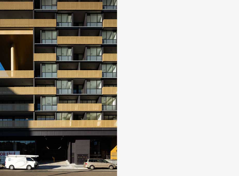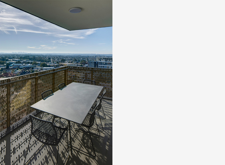 The slender building form of Imperial is aligned to Treacy Street, setting back at street level to create a generous pedestrian retail terrace. The ground level is activated with apartment lobbies, shops and community room. Above the street the built form is bisected with a slot and punctuated with carefully-placed surface recesses to reduce its visual bulk; and respond to the scale of the existing and future context. The building slot is aligned with the visual axis of Alfred and Bellevue Streets, visually connecting Hurstville and Kogarah, the two side sides of the rail corridor. The apartments have district views over Hurstville, water views to Botany Bay and panoramic views to the city skyline.