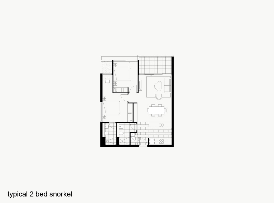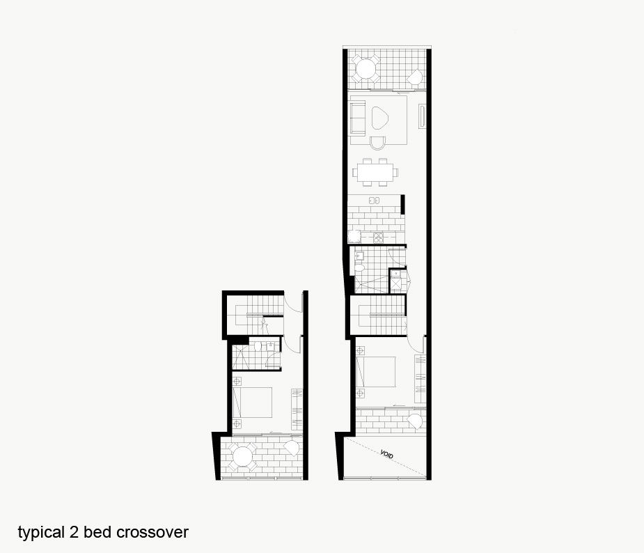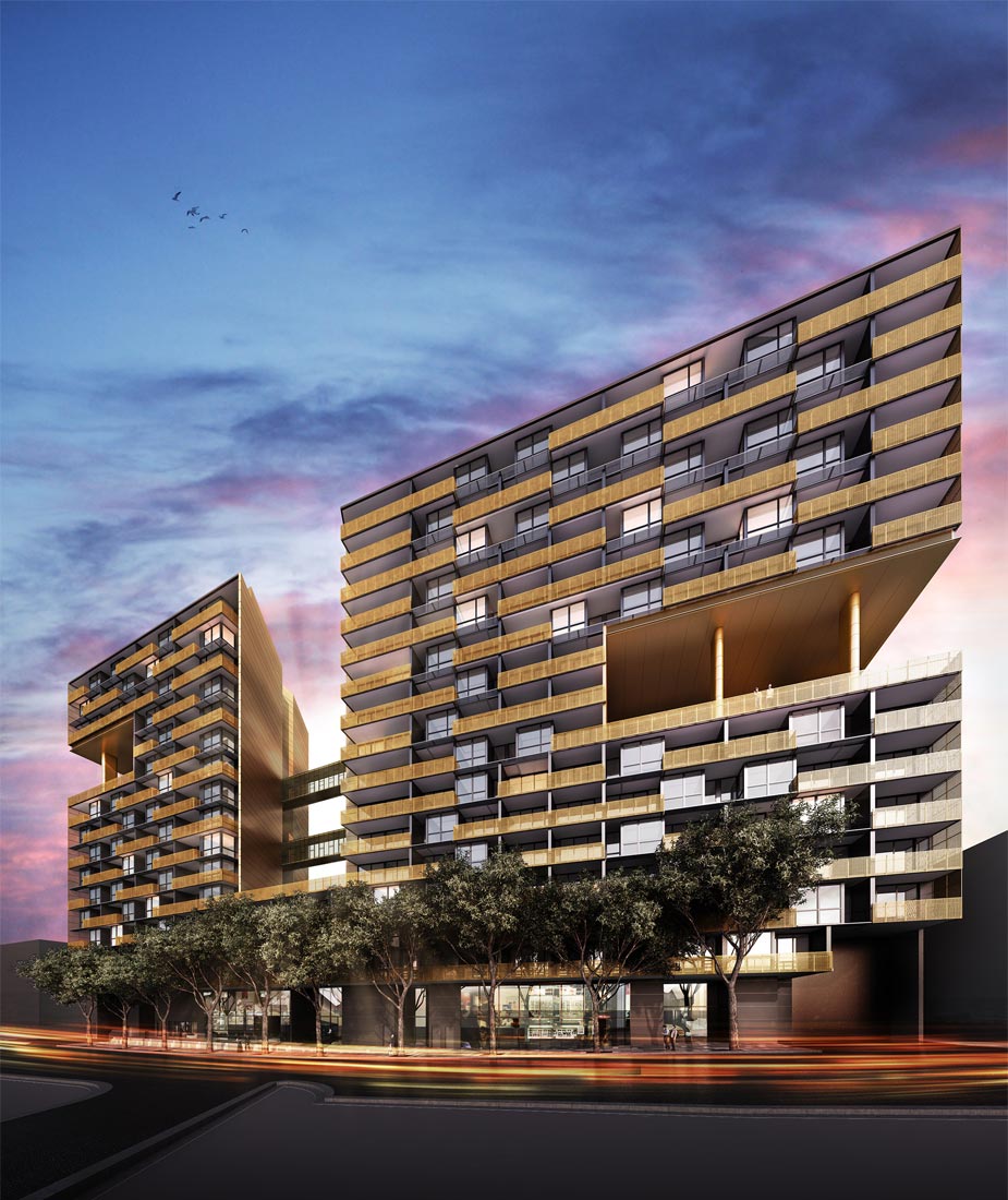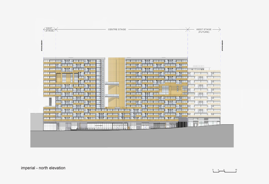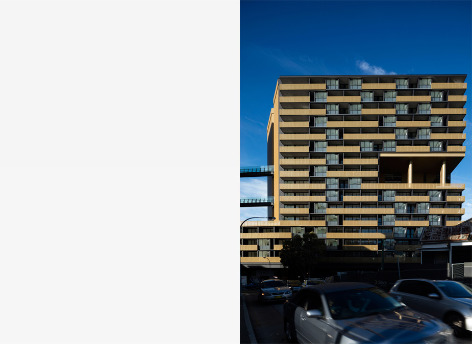 Imperial Central is a hybrid form that is a fusion of three form types: the urban street wall; slab; and towers. This hybrid form is cut with a slot into two roughly equal parts and perforated with recesses to break down its visual bulk and mass. Connecting bridges between the two towers are evident in the slot that prviews out, along the visual axis and are part of the ‘social network’ for residents. The recesses in the north and east facades of the building mediate between the scale of the slab form and the adjoining context while retaining the urban scale of the building in the Hurstville City Centre. Imperial presents as two interlinked towers to decrease its mass and bulk and to optimise the perimeter for light and ventilation.