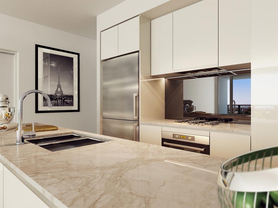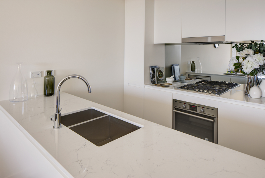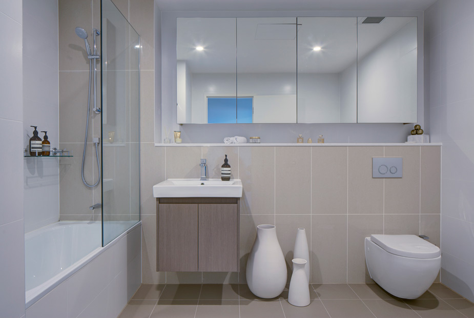 There are many apartment types and layouts – compact and generous, wintergarden, cross-over and single level suited to a variety of lifestyles, most with media alcoves or studies. Living rooms have 2700mm high ceilings. The fitout of the apartments has been designed to be well above the standard of the Hurstville area – with warm, neutral colour palettes, inspired by the tones of nature. Most kitchens have island benches with stone benchtops. They are equipped with AEG appliances and wide fridge spaces. Bathrooms are fitted with LED lighting, stone benchtops and tiled splashbacks, and abundant storage space in ‘low hanging’ vanities.