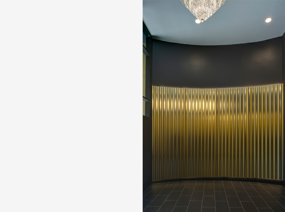 The three entry lobbies have bronze batten walls, natural stone flooring and crystal-like, pendant lights.