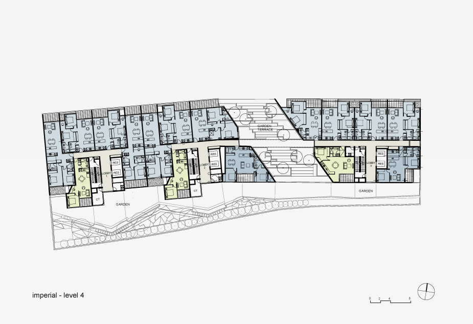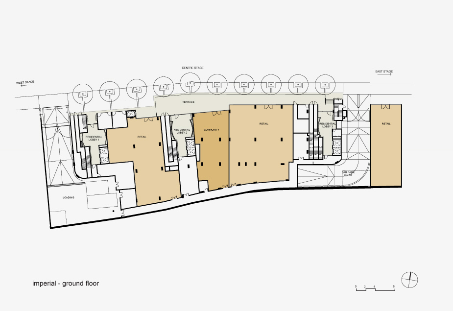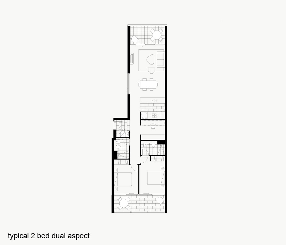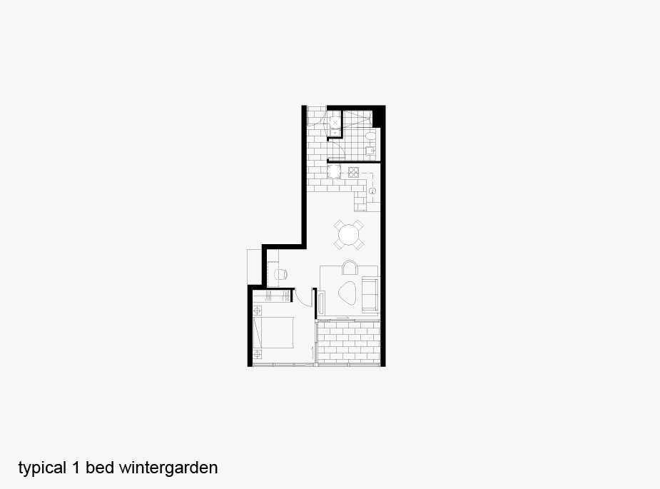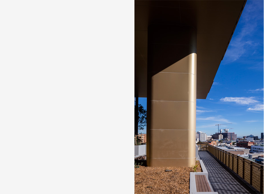 Imperial has many external green spaces: a podium courtyard, sky gardens and roof terrace. The main podium communal courtyard functions as space of conversation and meetings for residents and contains planting, seating, gravel pathways and a water element. The sky gardens are ‘green roofs’ with succulents and provide a social network of breakout spaces over the building. The roof garden, located in the slot between the tower forms, is a communal meeting space with views to the north and south.
