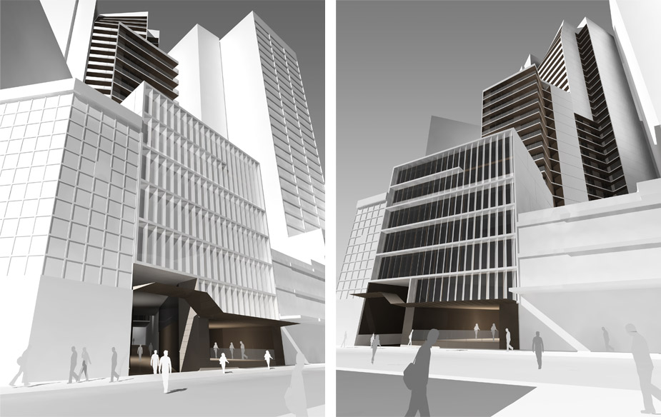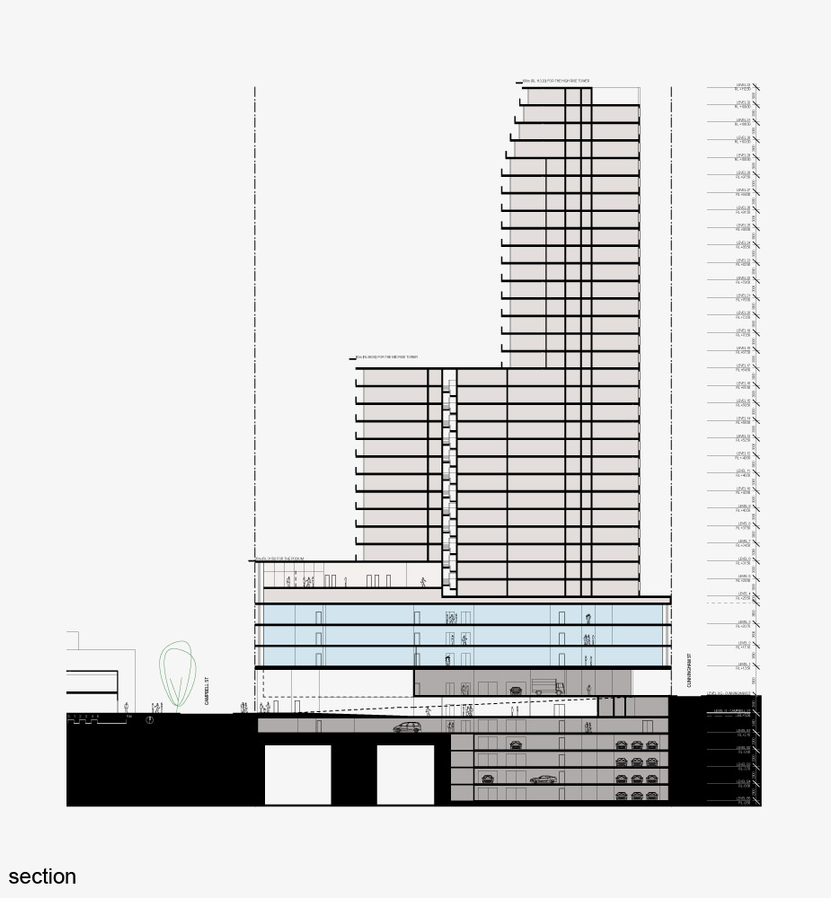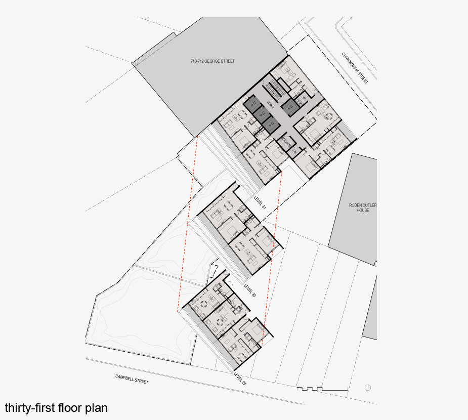 The proposal comprises three elements and related areas; a low-rise element containing 5 levels of retail and the ‘office box’, facing Campbell and Cunningham Streets with a maximum parapet height of 26 metres (RL 31.5); a mid-rise element containing 12 levels of serviced apartments with a maximum street parapet height of 60 metres (RL 66.00); a high-rise element containing 17 levels of serviced apartments with maximum parapet of 108 metres (RL 113.20); and ground level forecourt and pedestrian through-site, public way that c