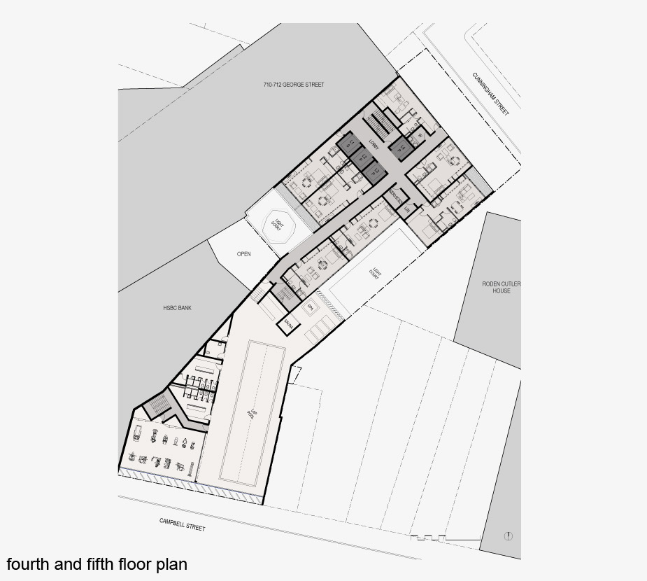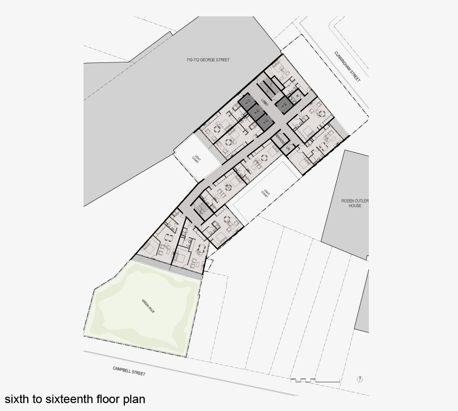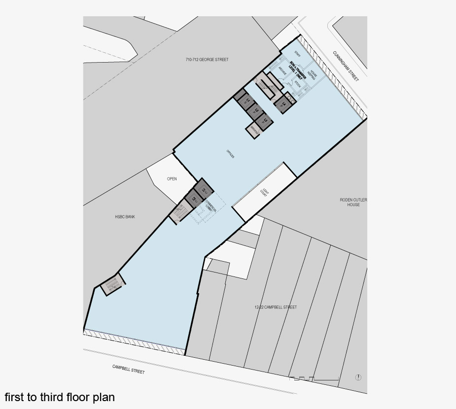 The serviced apartments are accessed off a lobby from Campbell Street. 1 and 2 beds are generally located at higher levels, face south and north and are provided with balconies. Studios do not have balconies. Commercial uses comprise 5,000sqm offices and 200sqm retail. Retail is located on Campbell Street, adjacent to the through-site pedestrian way. Office floors are approx 1,000sqm and can be subdivided into smaller strata offices. The offices are accessed from a lobby on Campbell Street.