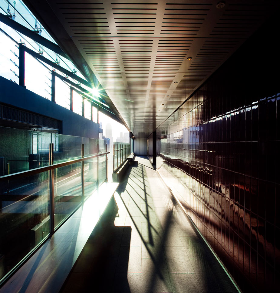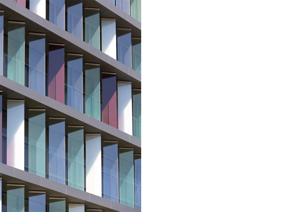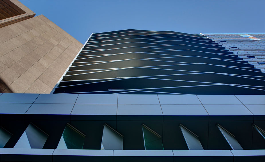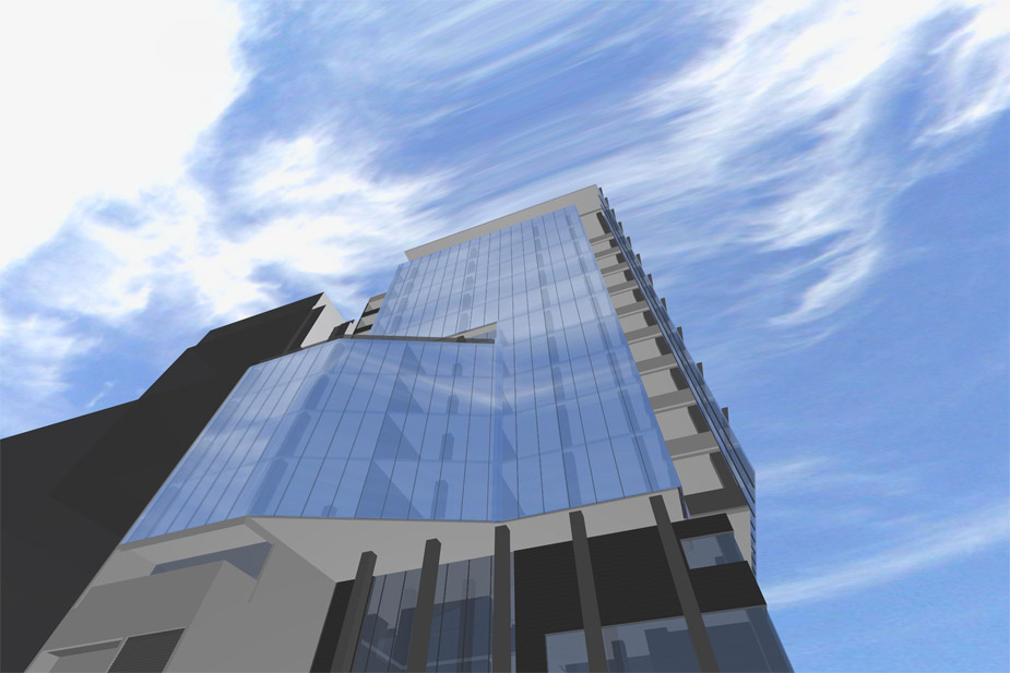 The building design enhances the amenity of spaces by creating a high level of natural light into the office by south and north facing glazing and light courts in the centre of the 60 metre deep floor plate, a high level of natural light to the apartments by light courts, and east and south facing glazing, reduced heat gain to the western elevation by minimising openings and balconies to 1 and 2 bedroom serviced apartments (no balconies to studios).