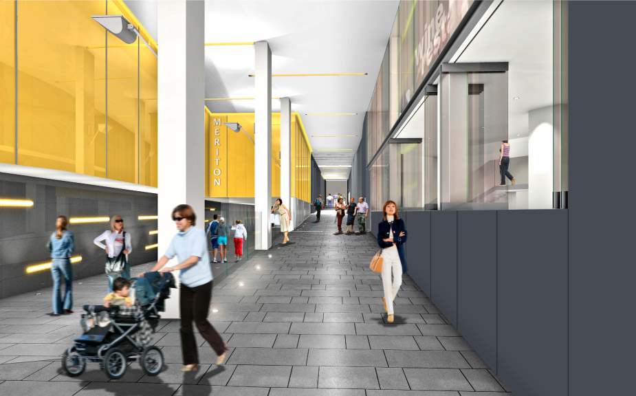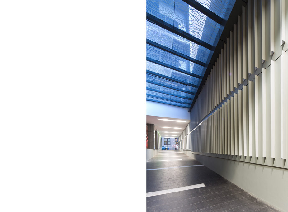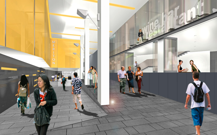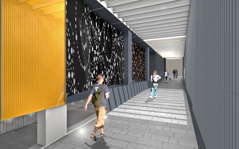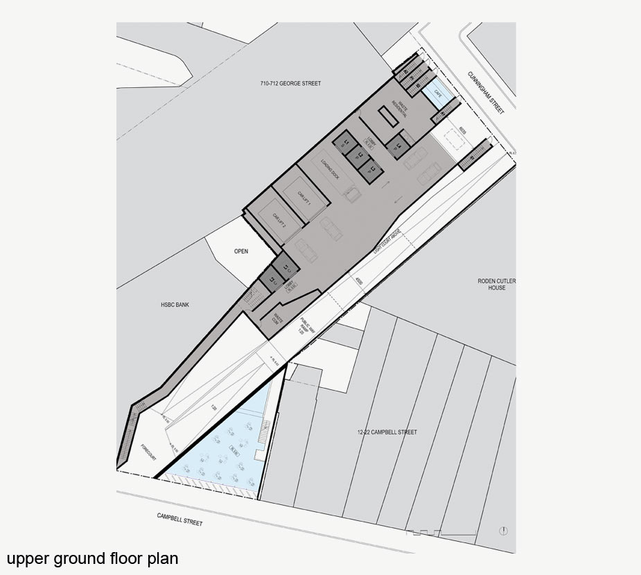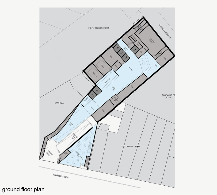 The pedestrian way is defined as a straight line through the site that visually connects the streets at each entry. It is marked by a generous forecourt on Campbell Street and necked alley way towards Cunningham Street, with potential for ‘electric’ or pictorial art. The 4.5 metre wide pedestrian way is an accessible pathway through the site, without any mechanical device. A gently graded ramp of 1:20 to 1:25 simulates the street condition on George and Pitt Streets.
