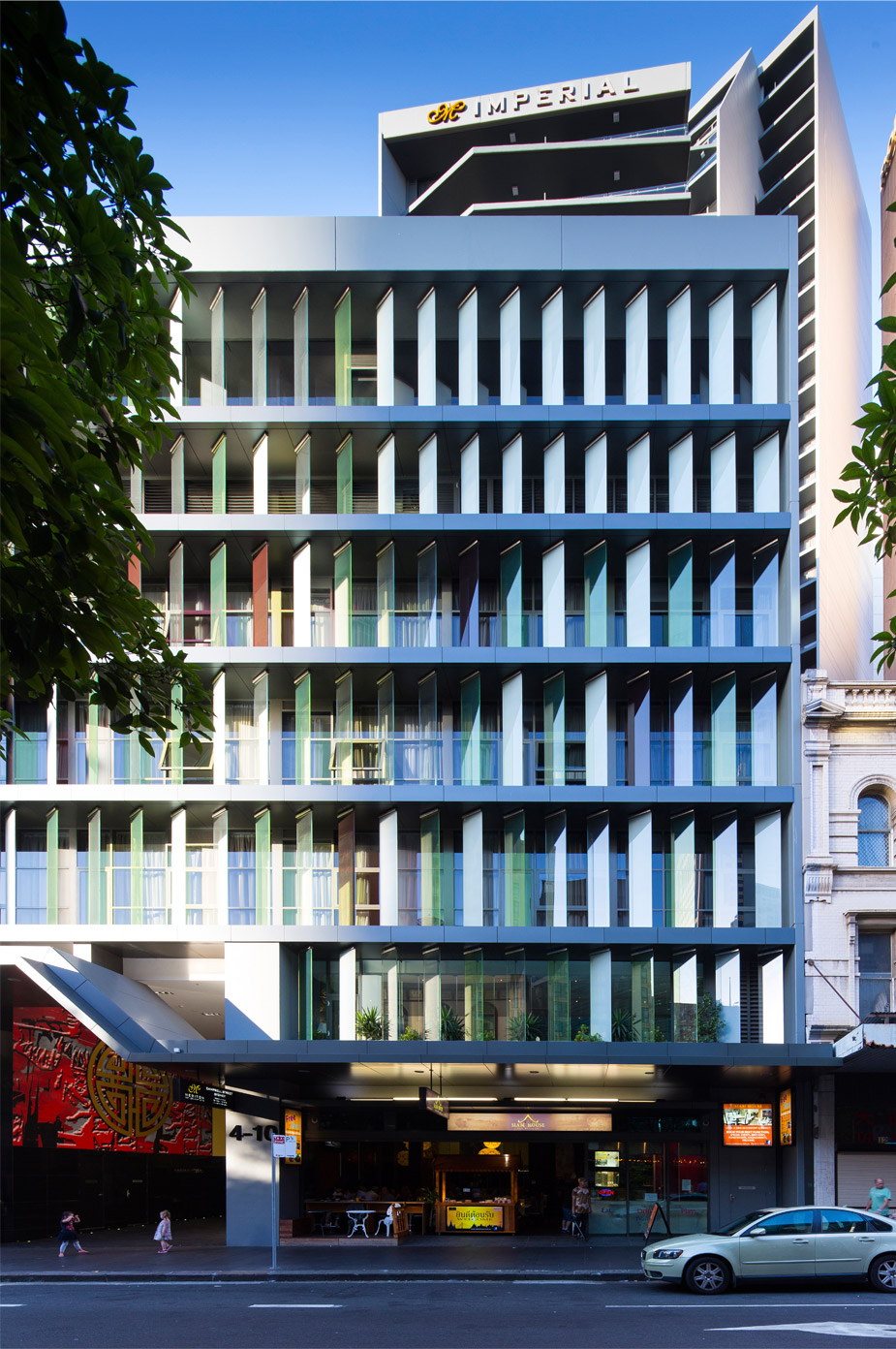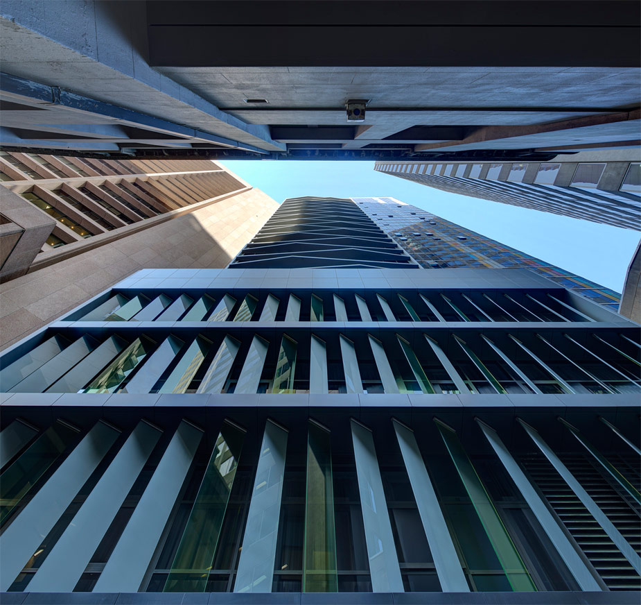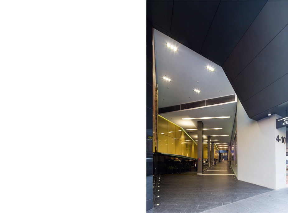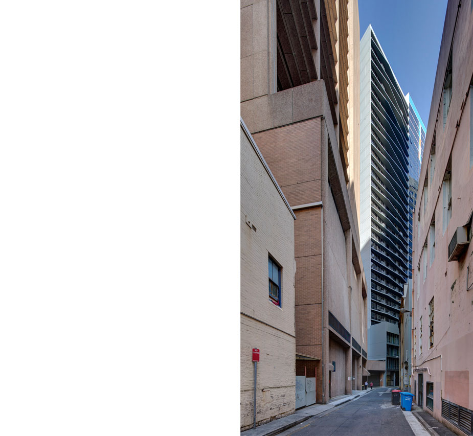 The project design is based on the intersection of two straight lines that represent movement systems – the 60m horizontal line of the through-site pedestrian way and the 100m vertical line of lift transport and fire egress stairs. The site is located at 4-10 Campbell Street Sydney, currently occupied by Mission Australia. All existing buildings on the site were demolished for a proposed mixed-use development, comprising serviced apartments, offices and retail.