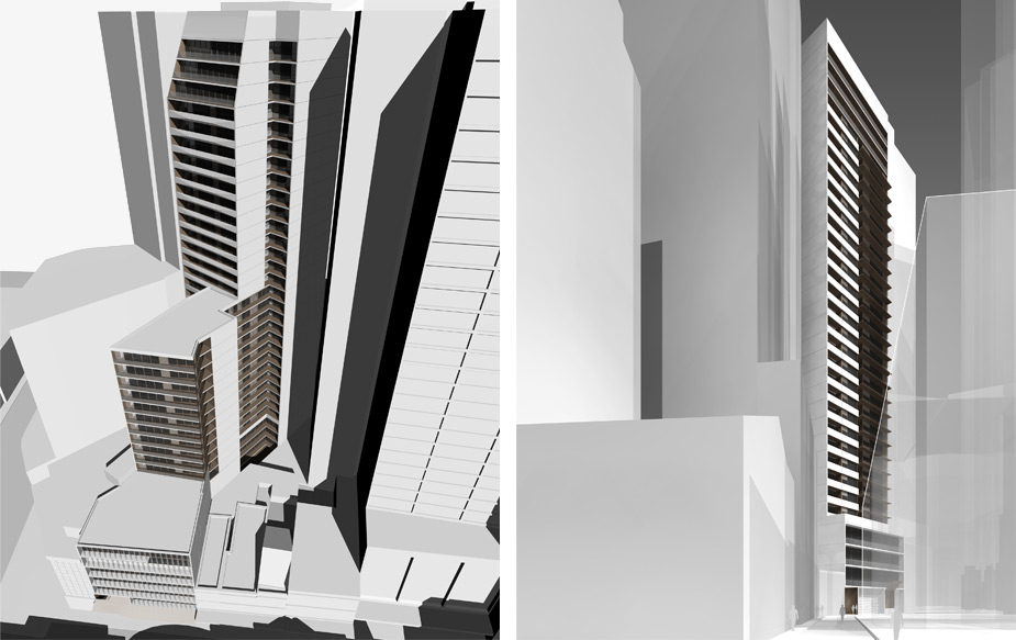 The pedestrian way threads along the eastern boundary of the narrow site without compromising the servicing of the tower or access to the upper level offices. It required the relocation of three ‘obstacles’ approved in the Stage 1 DA:the street level substation on Cunningham Street to the basement, the apartment waste room to the western boundary at Cunningham Street and office lift core to the western boundary. Sun light access to the public domain of Belmore Park is maintained by the strict compliance of the proposal with the Belmore Park Sun Access Plane in the DCP.