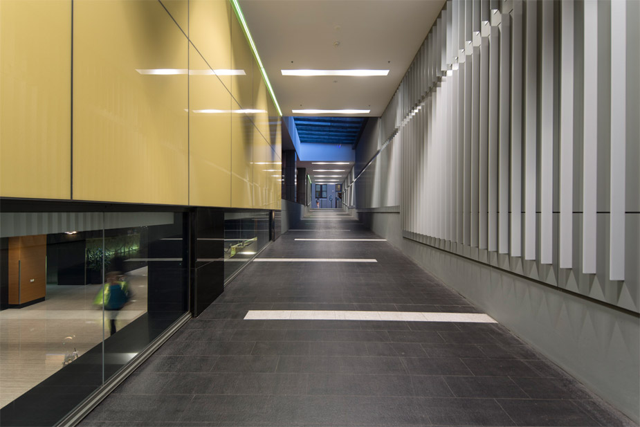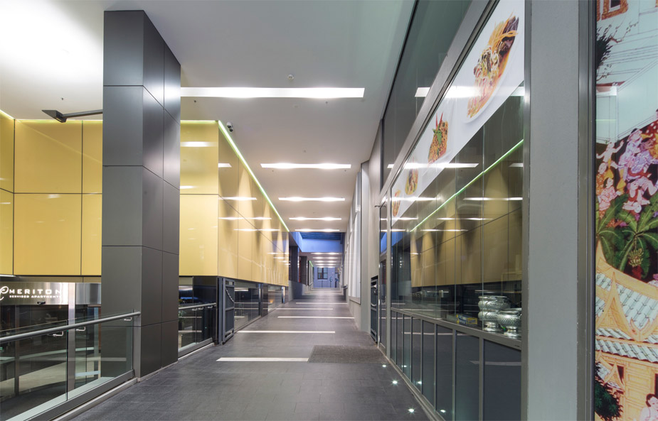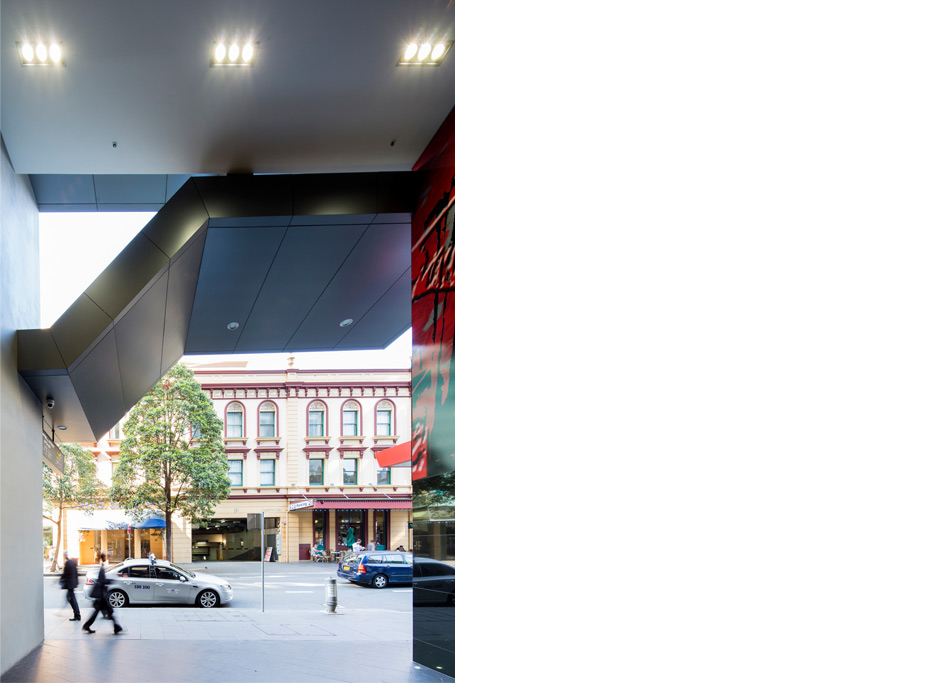 The building activates Campbell and Cunningham Streets by the through-site pedestrian way, access to lobbies and retail at street level. The project incorporates a north-south pedestrian through-site, public way that connects Campbell Street and Cunningham Street and completes a pedestrian way from the Capitol Theatre to World Square.