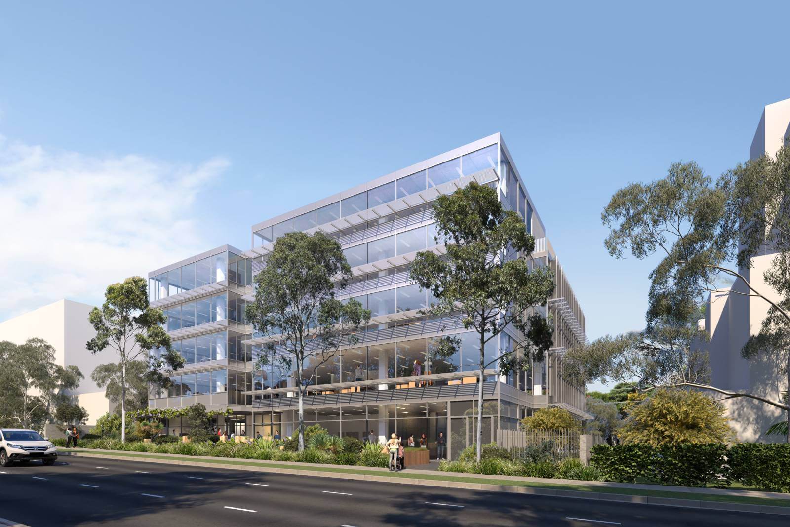 The lightweight metal features, deep recesses and articulated front and side elevations are all important architectural devices that create an appropriate bulk and scale to the street that is clearly distinguished as a health service facility within an anticipated future mixed-use context.