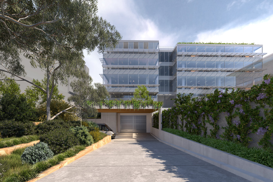 The vehicular entry is from Flide Street which ramps down to an entry portal and is lined with an extensive planted embankment with terraced sandstone blocks. The roof over the entry portal is planted with self-sustaining succulents that spill over the edges.