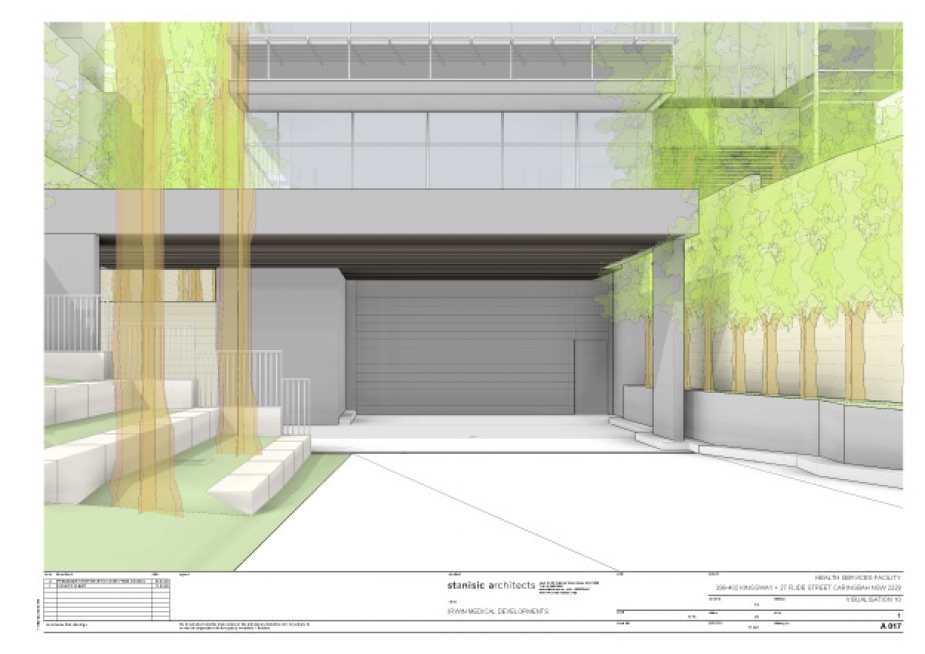 The lightweight metal features, deep recesses and articulated front and side elevations are all important architectural devices that create an appropriate bulk and scale to the street that is clearly distinguished as a health service facility within an anticipated future mixed-use context.