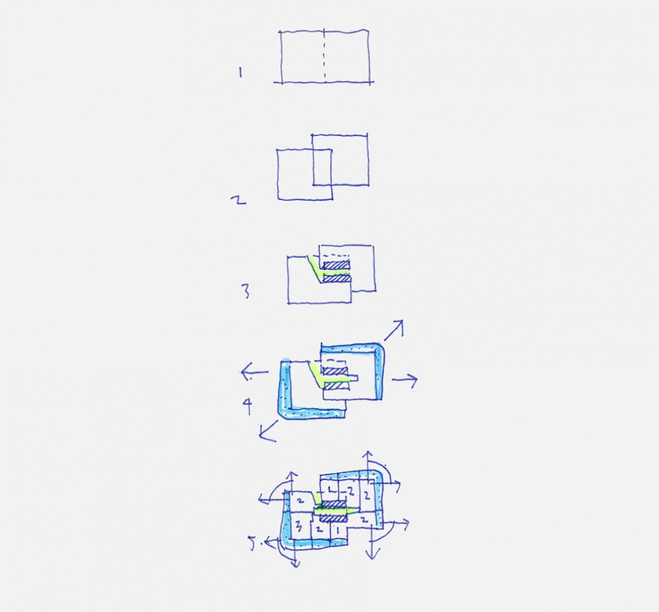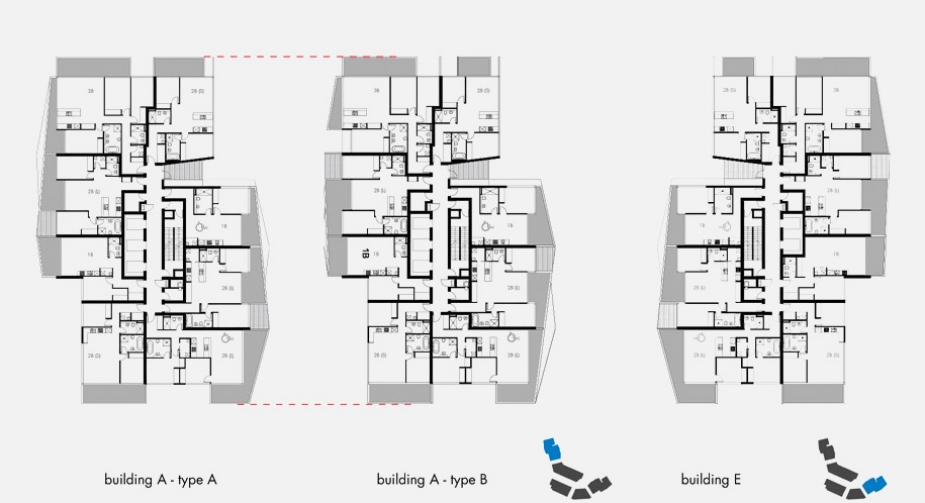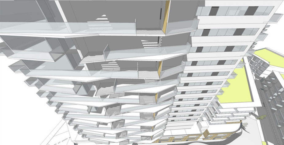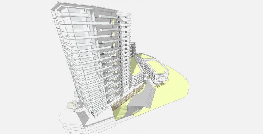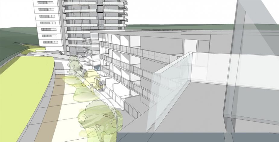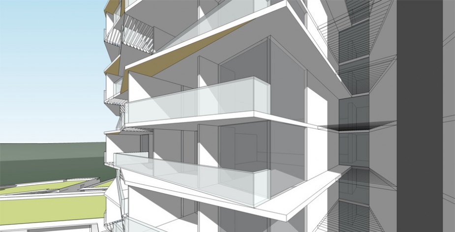 The tower, and its mid height companion, have been designed to be buildings ‘in-the-round’. Unlike urban buildings in urban renewal areas such as Victoria Park or in urban centres defined by street blocks they are designed to be viewed from the corners, ‘without a front or back’. The forms have been adjusted to create ‘opposing asymmetry’, thereby allowing the built form to be mirrored on opposing corners. The apartment layouts are planned with living rooms on the corners to enjoy the expansive district and distant views. The horizontal emphasis of the facades within vertical columns create panoramic, rather than blinkered, views from all apartments. The lower 6 storey buildings extend along the terraces and have an outlook and view to both the north and south, and maximising solar access.