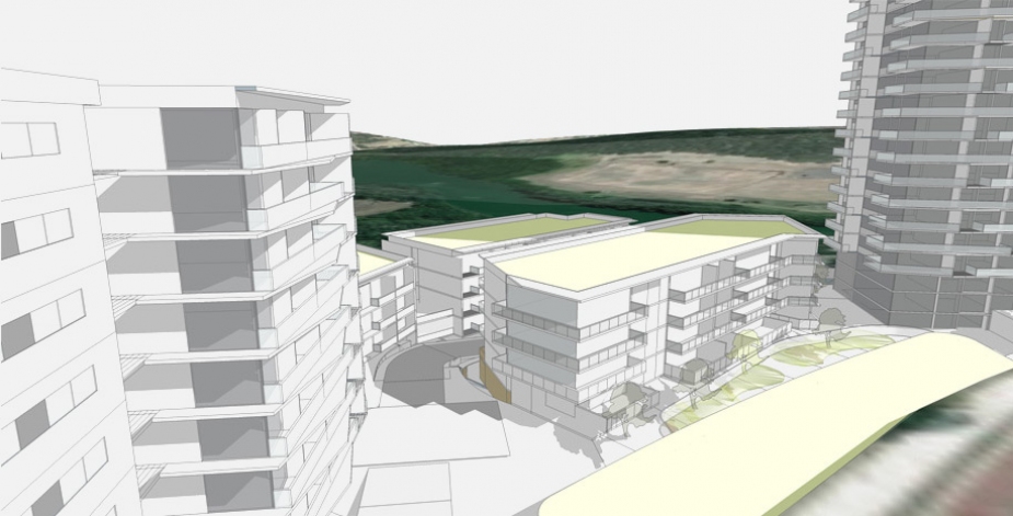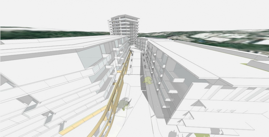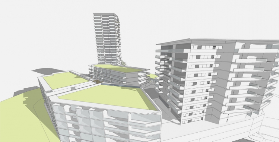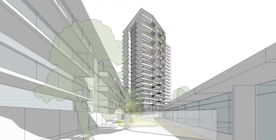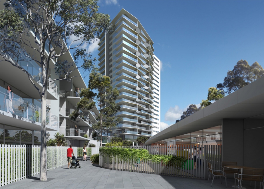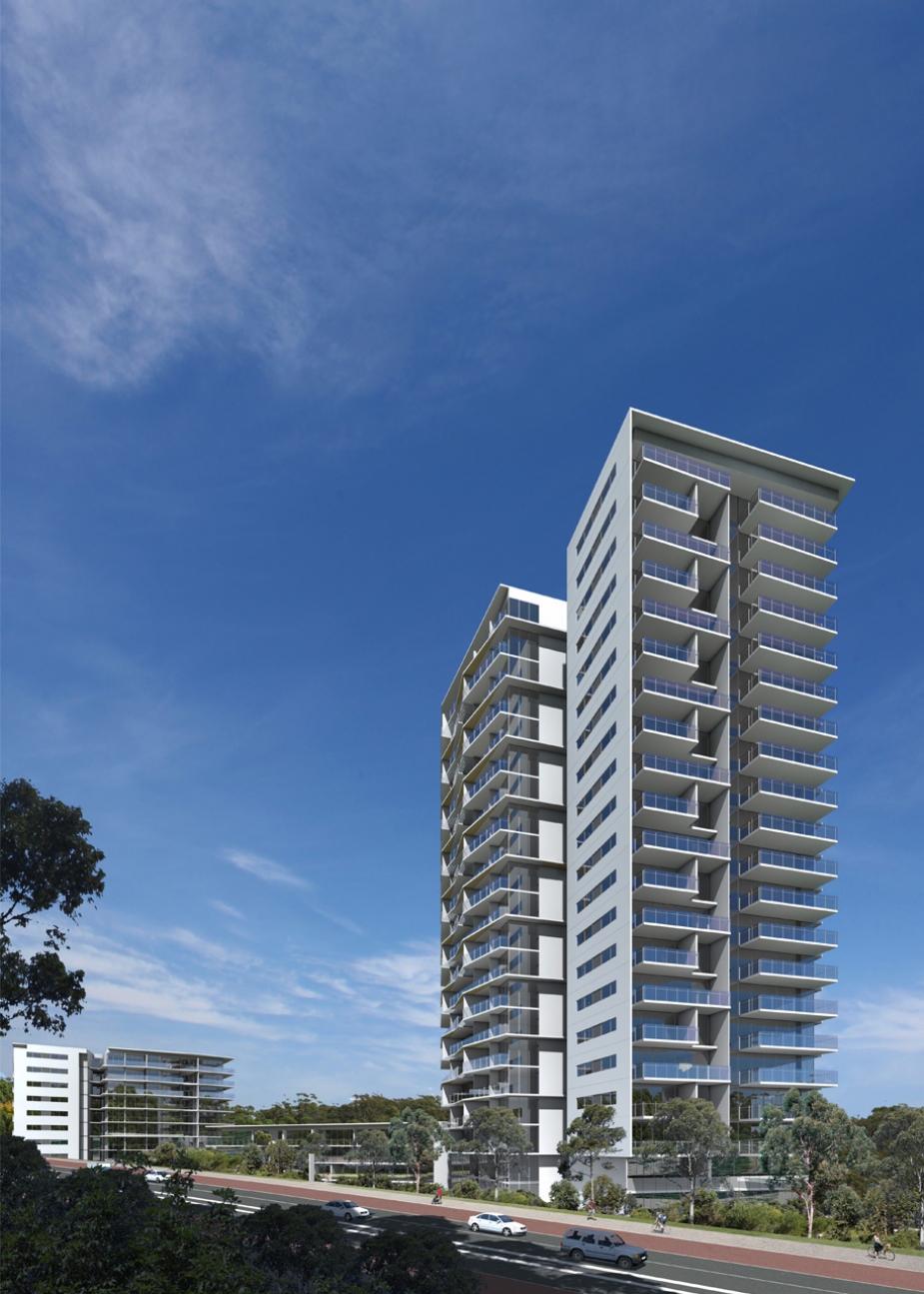 The architecture of the buildings responds primarily to three concepts: the interface of the buildings with the open space; the response to the wider landscape setting and views; and built form articulation through surface treatment and controlled variation. The siting of the lower 6 to 10 storey buildings reinforces the open spaces, step down the hill and and emphasise the topography of the site. The taller tower is designed to both complement its landscape setting and maintain its identity as a bold, modern addition to the cityscape. The tower and mid height tower are at opposite ends of the site and are similar in expression and anchor the proposal, providing urban markers when viewed from the east and west along Epping Road.