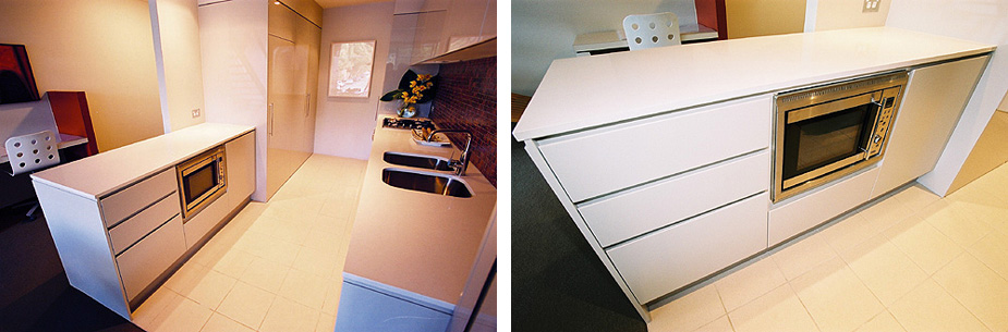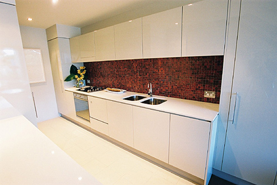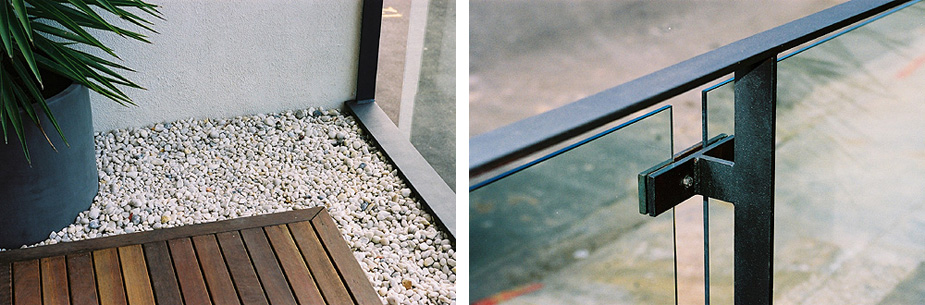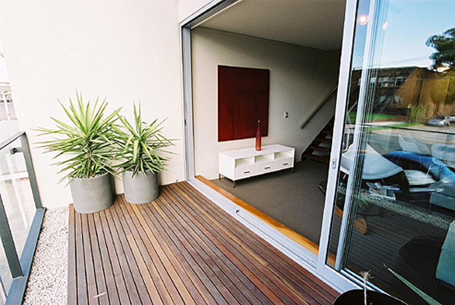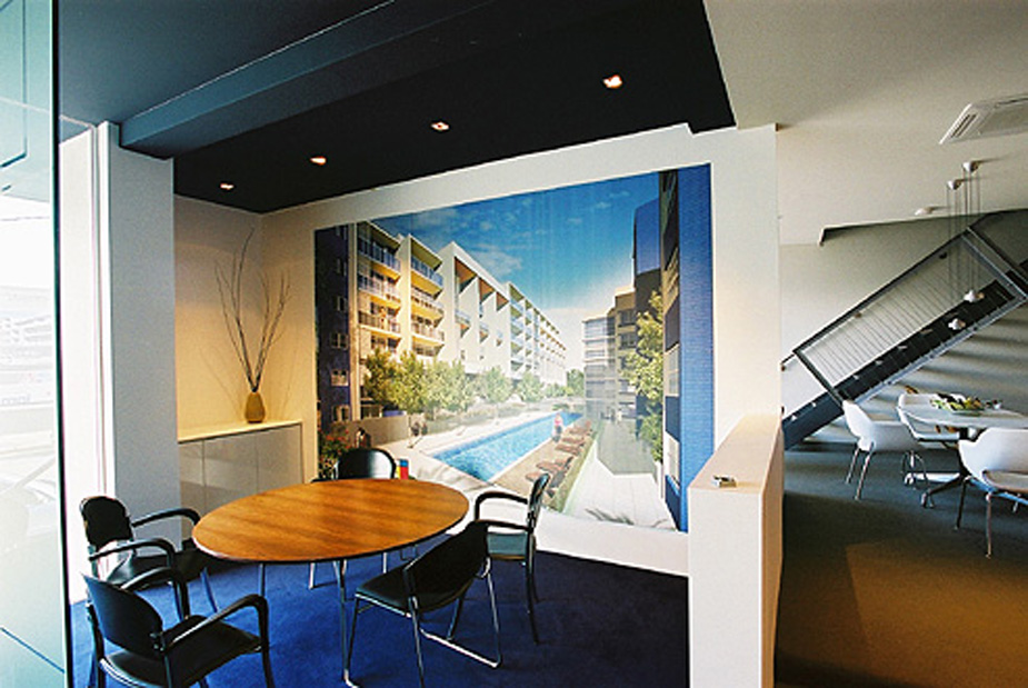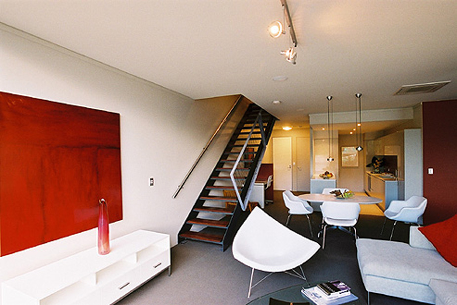 Display and marketing suite in warehouse building on site of development for 137 apartments; marketing area and fully furnished 2 storey + 2 bedroom apartment display suite seamless inside/ outside, floor to ceiling glass doors, sliding glass wall panels, kitchen as furniture, mosaic tile splashback, polyurethane joinery, vanities, glazed mosaic tiles, spotted gum decking, open steel tread staircase with wire balustrade, low voltage lights; chilli colour palette.