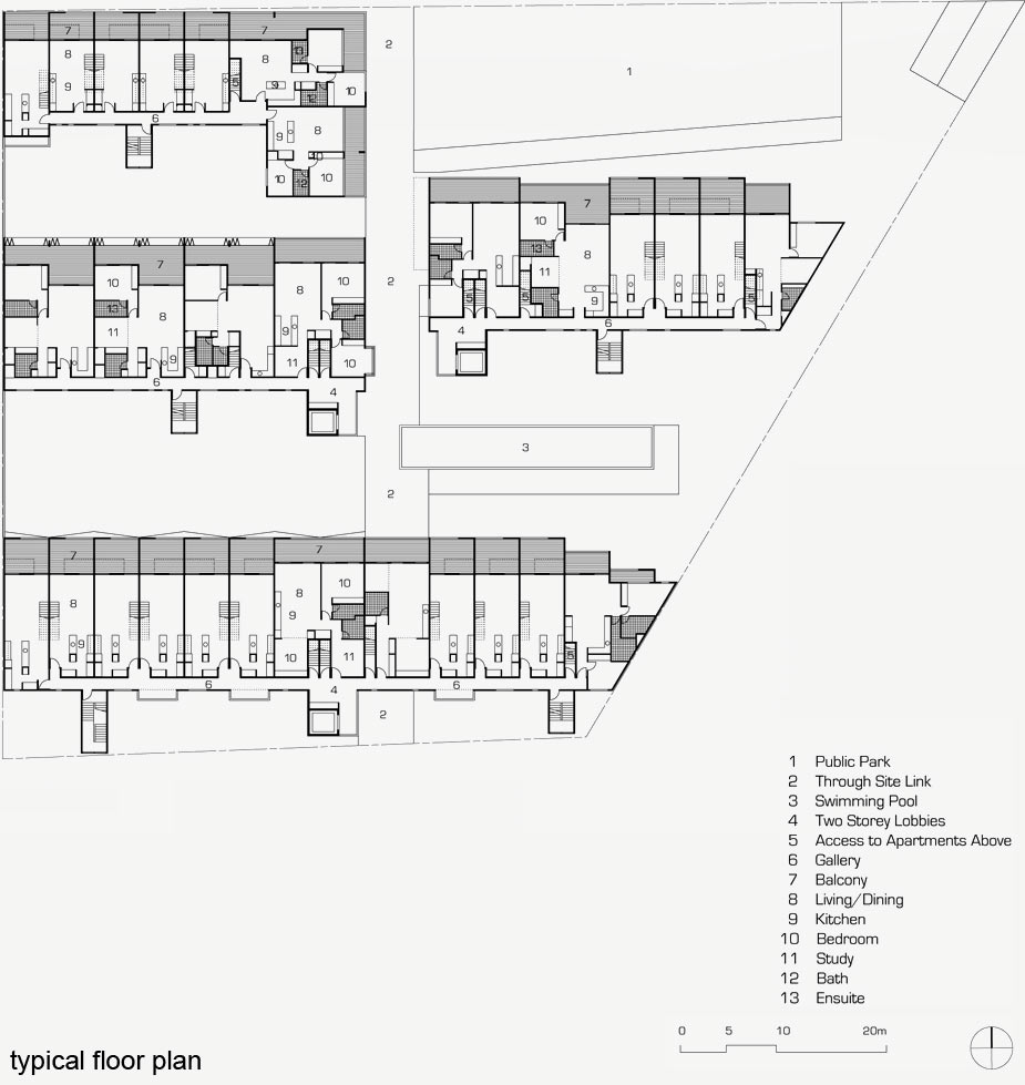 The heights of the buildings vary from four to seven storeys and are distributed to define public spaces and minimise the overshadowing of open space. The building courtyards are multi-functional spaces that provide ground level access to apartments, separation between habitable rooms, pools, seating and planting.