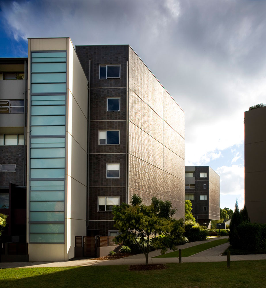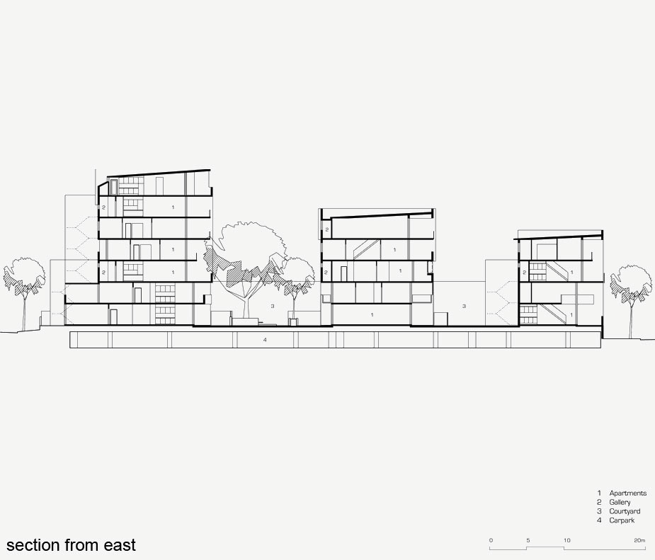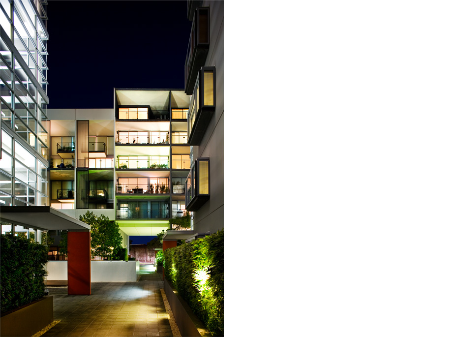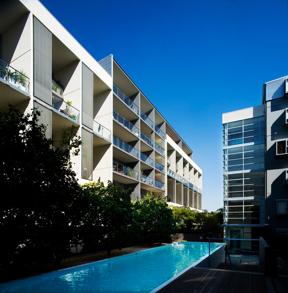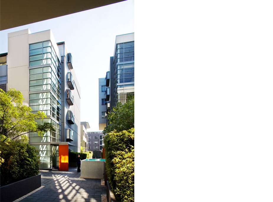 MONDRIAN consists of four slim-line buildings separated by finger courtyards. The ingenious building cross-section with living areas and balconies to the north and glass enclosed access galleries and related entry stairs to the south achieves a sustainable environment where low levels of energy consumption is balanced with high personal comfort. The buildings have hot and cool sides to create induced air currents – natural air conditioning.