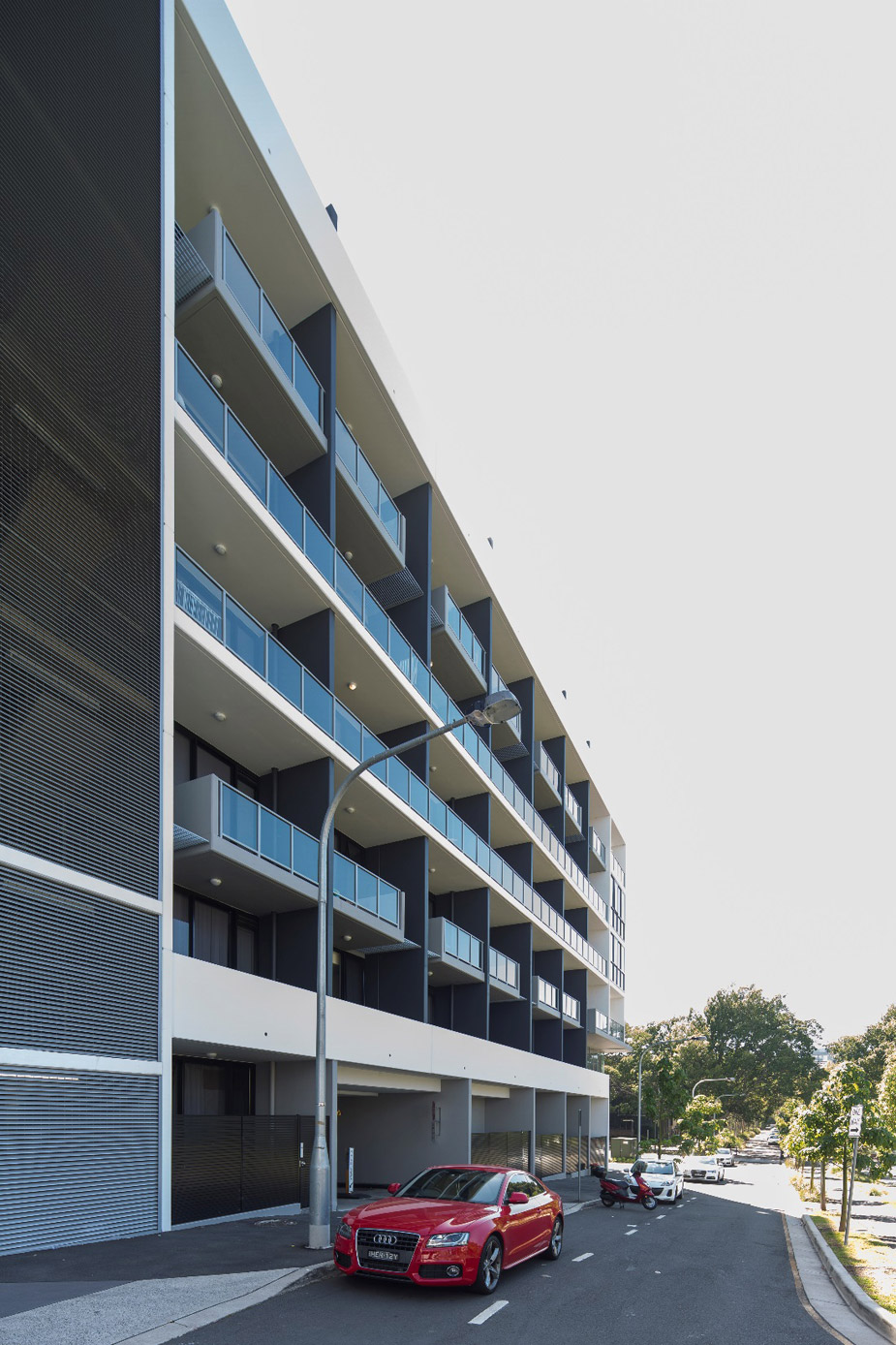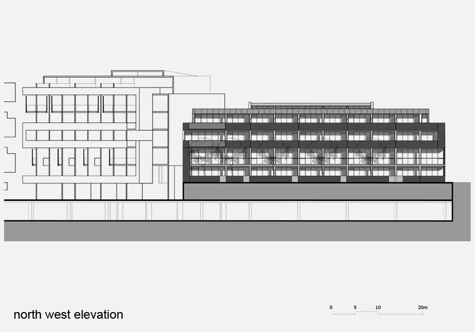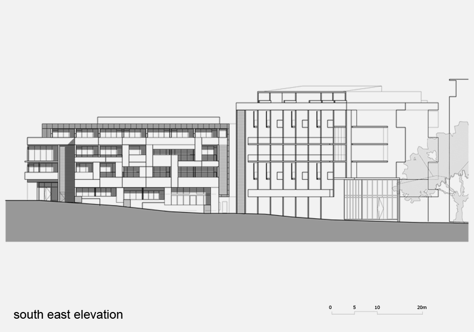 The northern elevations are designed with unifying horizontal, ribbon-like balustrades that weave and stretch across the north elevation that juxtapose with the adjoining single and two storey dwellings. The southern elevations are designed to frame the outlook to the new public park from the secondary balconies of the bedrooms that are accessed from living areas.