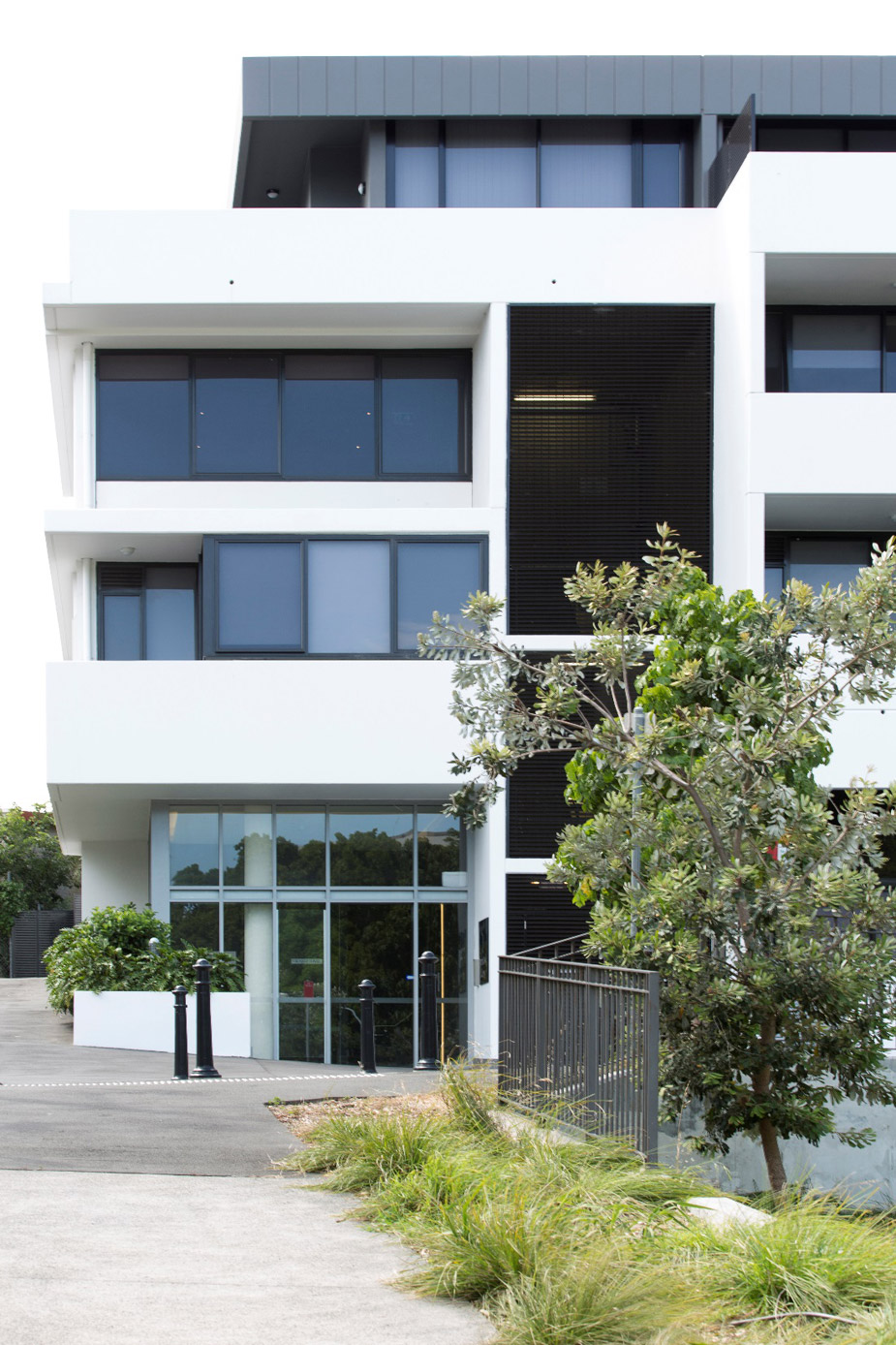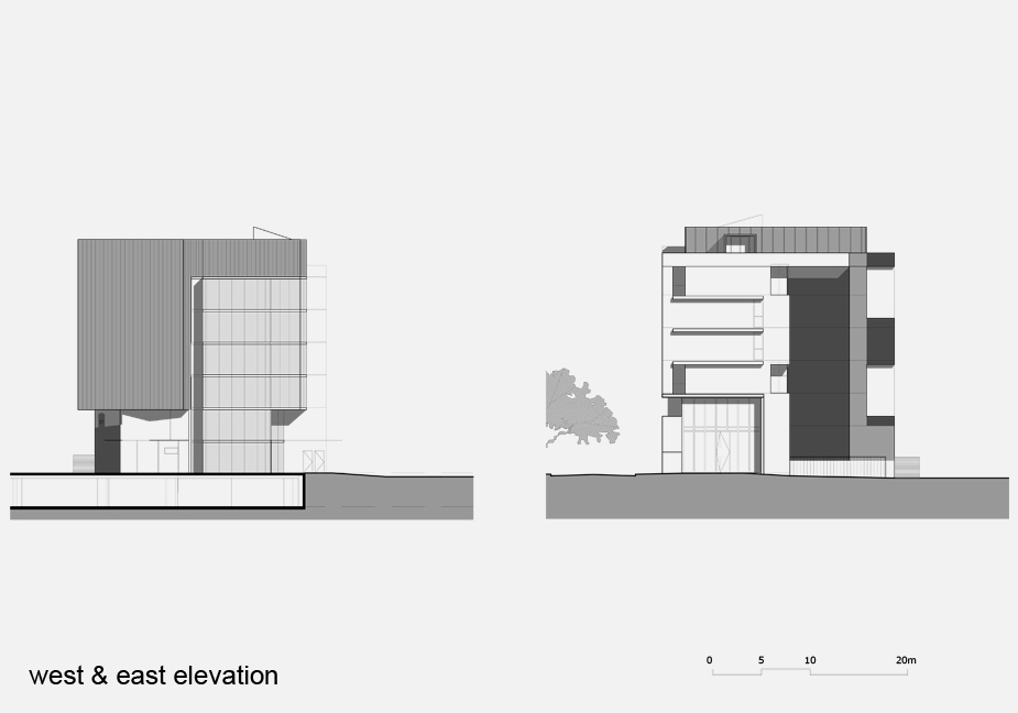 The attics of both buildings are clad in prefinished, zinc-like, metal panels and contrast with the painted precast, concrete masonry panels of the main building forms. The metal panels fold down onto the faces bounding the though-site public pedestrian way. The bounding face of Building A2 is activated by single and double storey, glass enclosed lift lobbies.