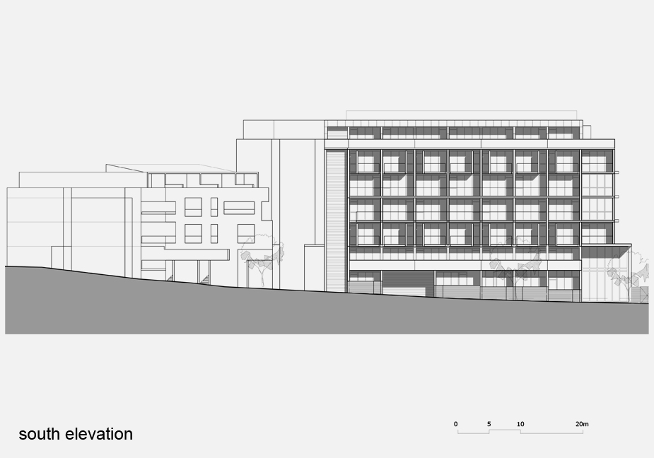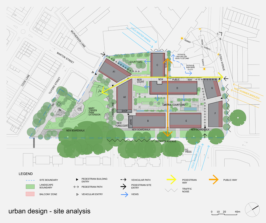 The southern elevation of Building A1 is designed with solid precast and punched openings to provide a fine pedestrian scale to mark the southern entrance of the through-site way and to provide a transition between the surrounding low-rise context and the masterplan site. This is contrasted with the amplified scale of open and glazed balconies to the southern elevation of Building A2, which respond to the larger scale of the remaining built forms around the central courtyard.