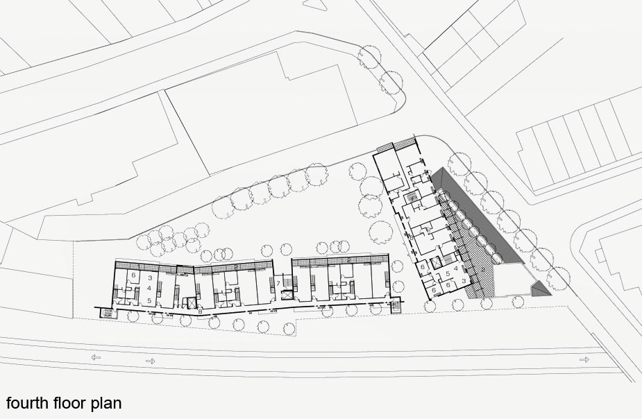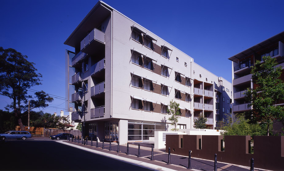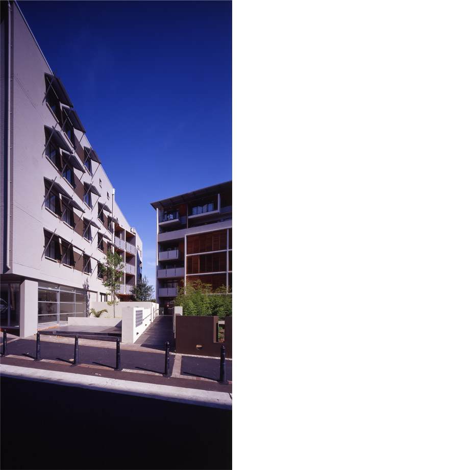 The architectural concept is a fragmented perimeter form composed of two highly articulated buildings, a ‘wedge’ and ‘edge’ form, arranged around a triangular-shaped, north facing courtyard, which tapers to the north-west along Brennan Lane. The residential project is located on a triangular-shaped site in the ‘hub’ of Newtown, adjacent to Newtown rail station and King Street, with long distance views to the south over railway tracks. It has a small frontage to Erskineville Road and long northern frontage to the narrow Brennan Lane. The southern boundary, along the railway cutting, faces onto the tracks and platform of Newtown rail station. The site is prominent in the district and can be seen from Erskineville Road and across the railway tracks.