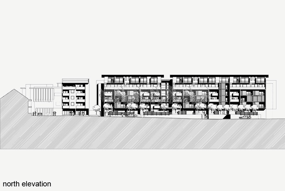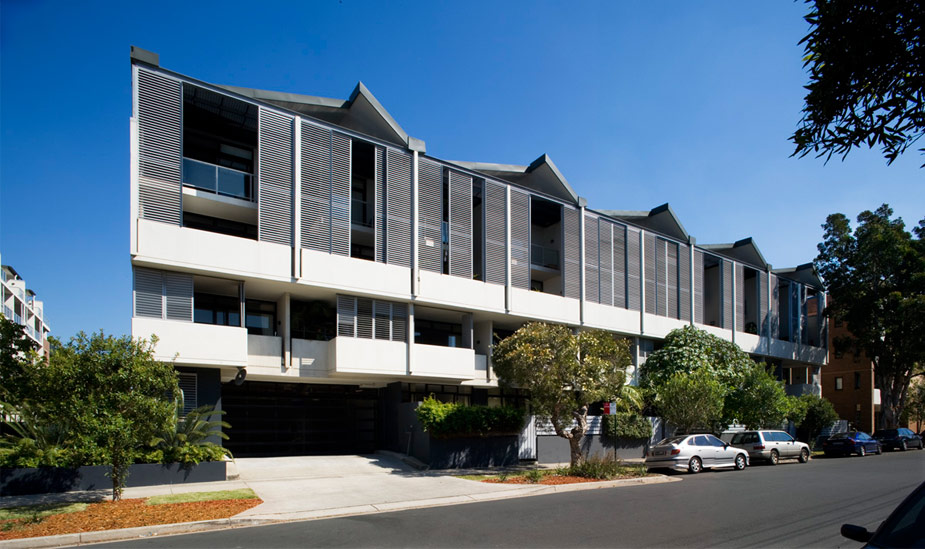 The ‘wedge’ building on Erskineville Road is developed as a thick, layered, urban street wall with extensive modelling and articulated balconies. It is punctuated with a large opening at ground level for the main entry and street based shops and café.