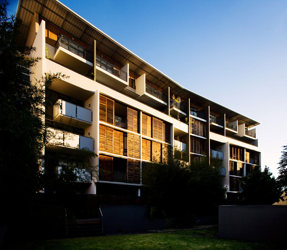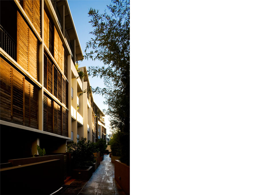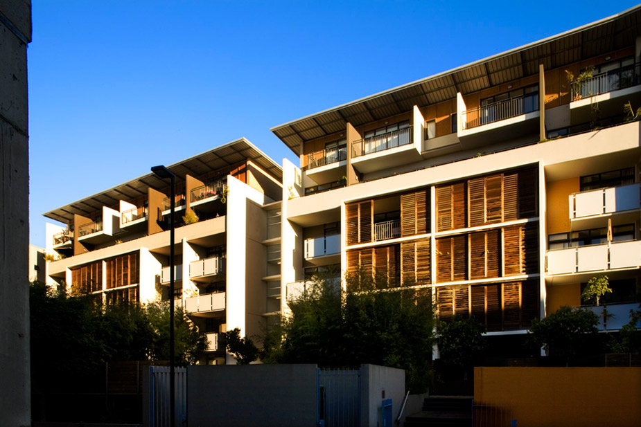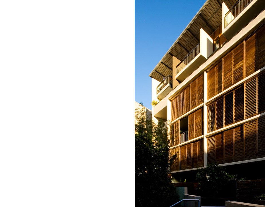 The buildings are finished in a combination of face brick, painted render over brickwork and painted, off-form concrete. The upper level is clad in light-weight, external plywood sheeting –‘Ecoply’. The distinctive, western red cedar, folding plantation shutters of the northern elevation of the ‘edge’ building provide sun control, privacy and extend the living areas onto the sun filled balconies. Bedroom balconies on the railway line are protected from train noise by projecting bay windows. Balustrades are varied and consist of pre-finished metal sheeting, vertical steel bars and painted, rendered solid masonry. The balustrades are designed for privacy and to accentuate the tectonic expression of the building.