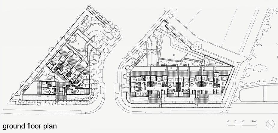 Lot 24 is a V-shaped block and lot 18 is a linear block sited parallel to the footway of Anzac Parade, Gubbuteh Road and the pedestrian way along the Eastern Suburbs banksia shrub reinforcing the definition of the street. The northern face of the building on lot 18 is designed to open onto Gubbuteh Road and mirrors the northern face of the building on Lot 24 with its views back to the city.