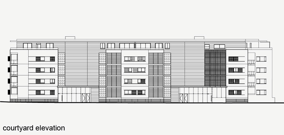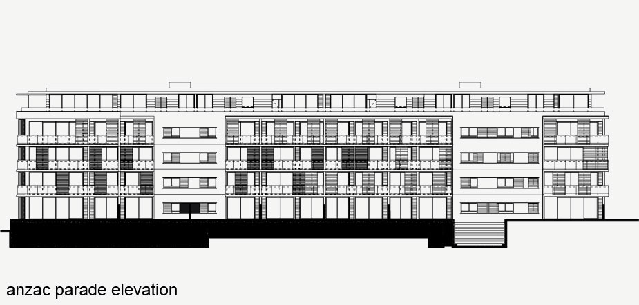 The west elevations of both buildings on Anzac Parade are developed as ‘stretched out’ planar walls with ribbon windows. They contrast with the crate-like appearance of the east elevations to the communal courtyards. The living areas of the apartments are orientated primarily to the east. The living areas opening to the north are shaded by the horizontal overhangs of the balconies. The openings to apartments on the west and east elevations are shaded with fixed and operable aluminium louvres and shutters.