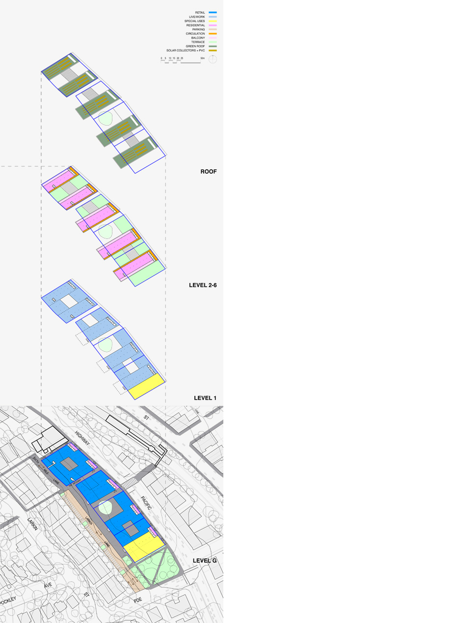 Specific issues are traffic noise from vehicles on the Pacific Highway; solar access to living areas; air flow integration of residential entries with shop fronts, apartment layouts in the slim-line forms; the definition of the new public space and lane (the Rifleway); staging and lot amalgamations; and the integration of servicing for shops with the Council car park.