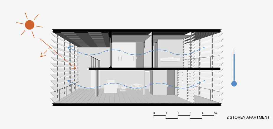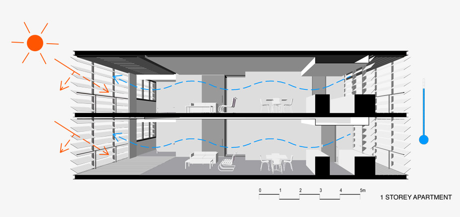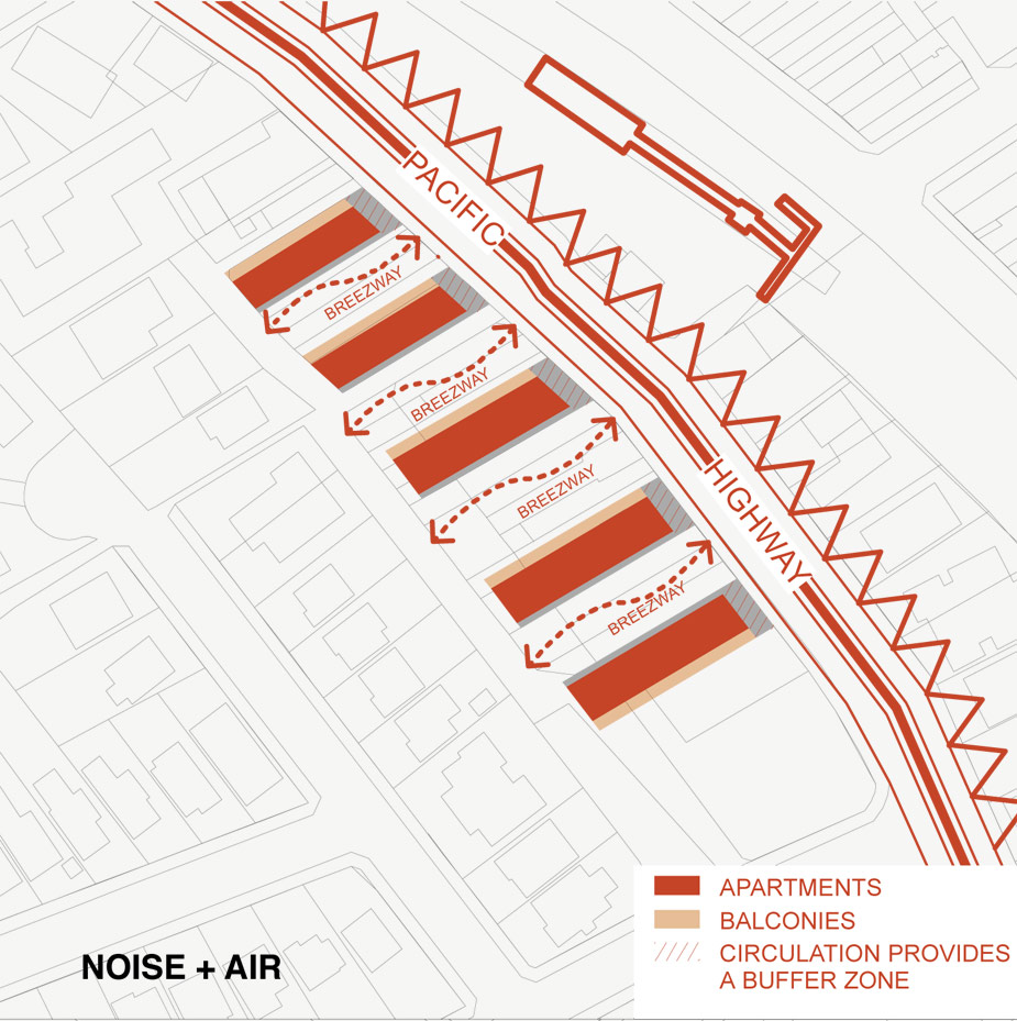 The site is affected by heavy traffic noise from the constant stream of vehicles on the Pacific Highway. The main living area balconies are turned to the north-west, away from the Pacific Highway. The indirect traffic noise can be further dampened by acoustic panels on the balcony soffits and glass panels at the balustrades. All live, work and shop areas are naturally, cross-ventilated. The need for air conditioning is eliminated.