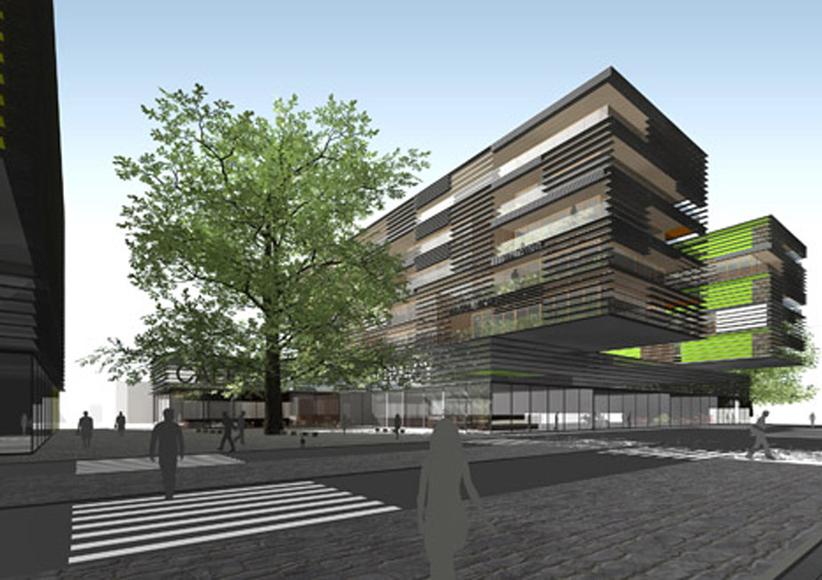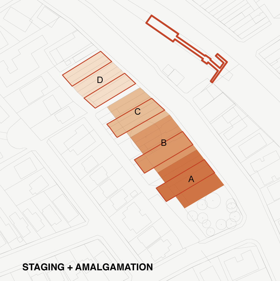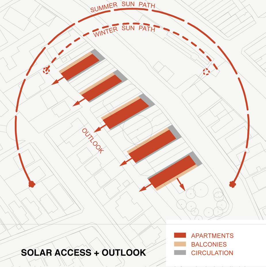 The site is cut into a number of slim-line building forms and courtyards and can be developed as four parts, with minimum 36 metre frontages, to the maximum ratio of floor space. The building forms provide apartments with cross ventilation, ample natural light, dual aspect and generous balconies. A multi-level public car park is located along the south-west boundary. Private car parking is located in two basement levels under the buildings.