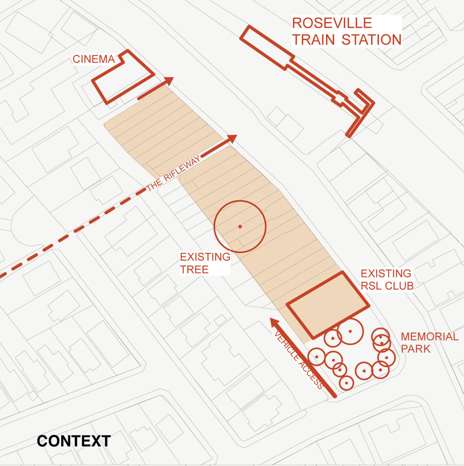 The site, which consists of numerous small titled lots, is currently occupied by an untidy variety of two-storey, shop-top buildings, a through-site pedestrian way (the Rifleway), a mature exotic tree, ground level Council parking, single dwelling lot and RSL Club adjacent to the Memorial Park (not part of the site). The historic Roseville Cinema forms the northern bookend beyond the site and brings an entertainment focus to the centre that can be supported by new shops.
